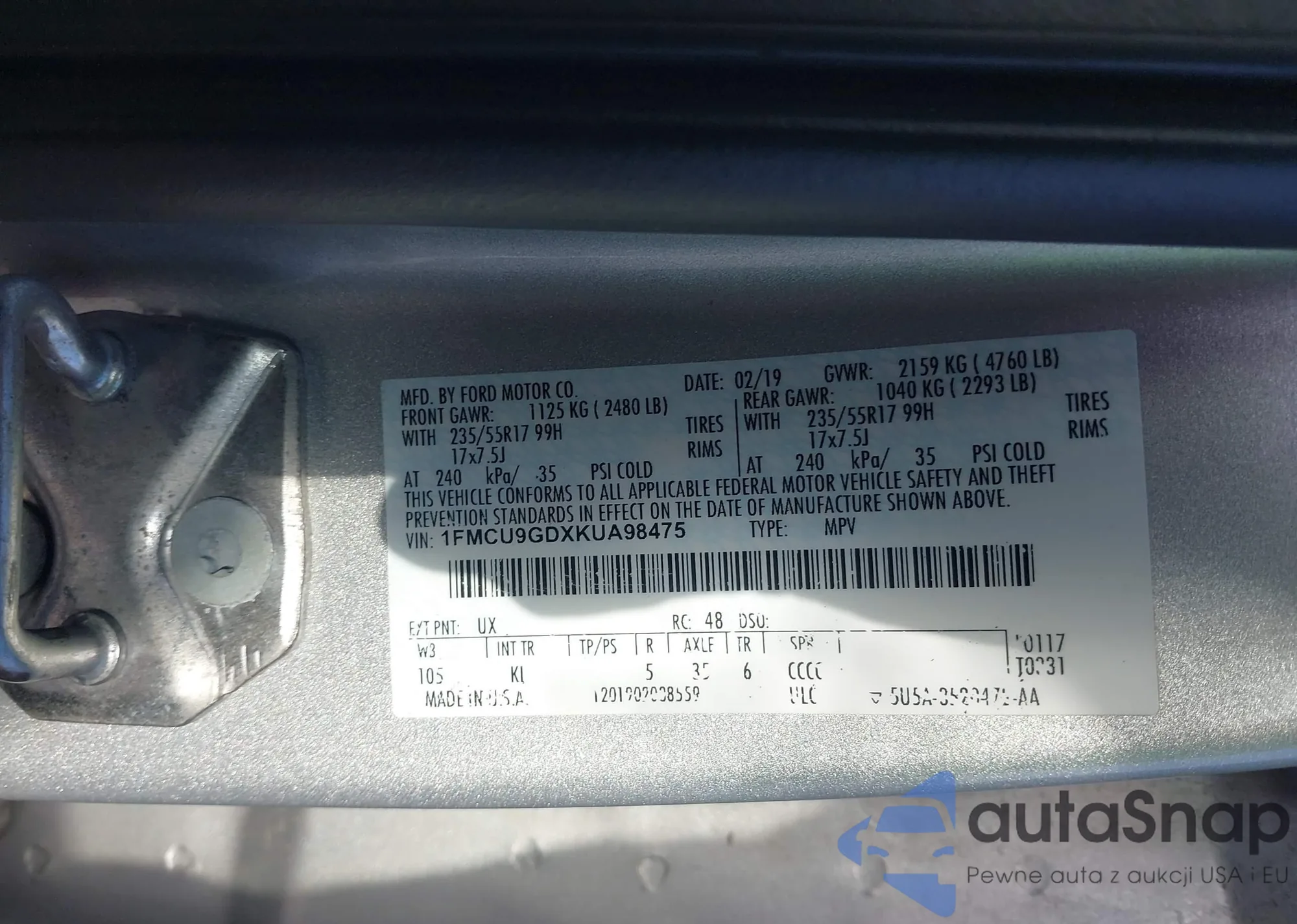 LOT: 44098989 VIN: 1FMCU9GDXKUA98475
