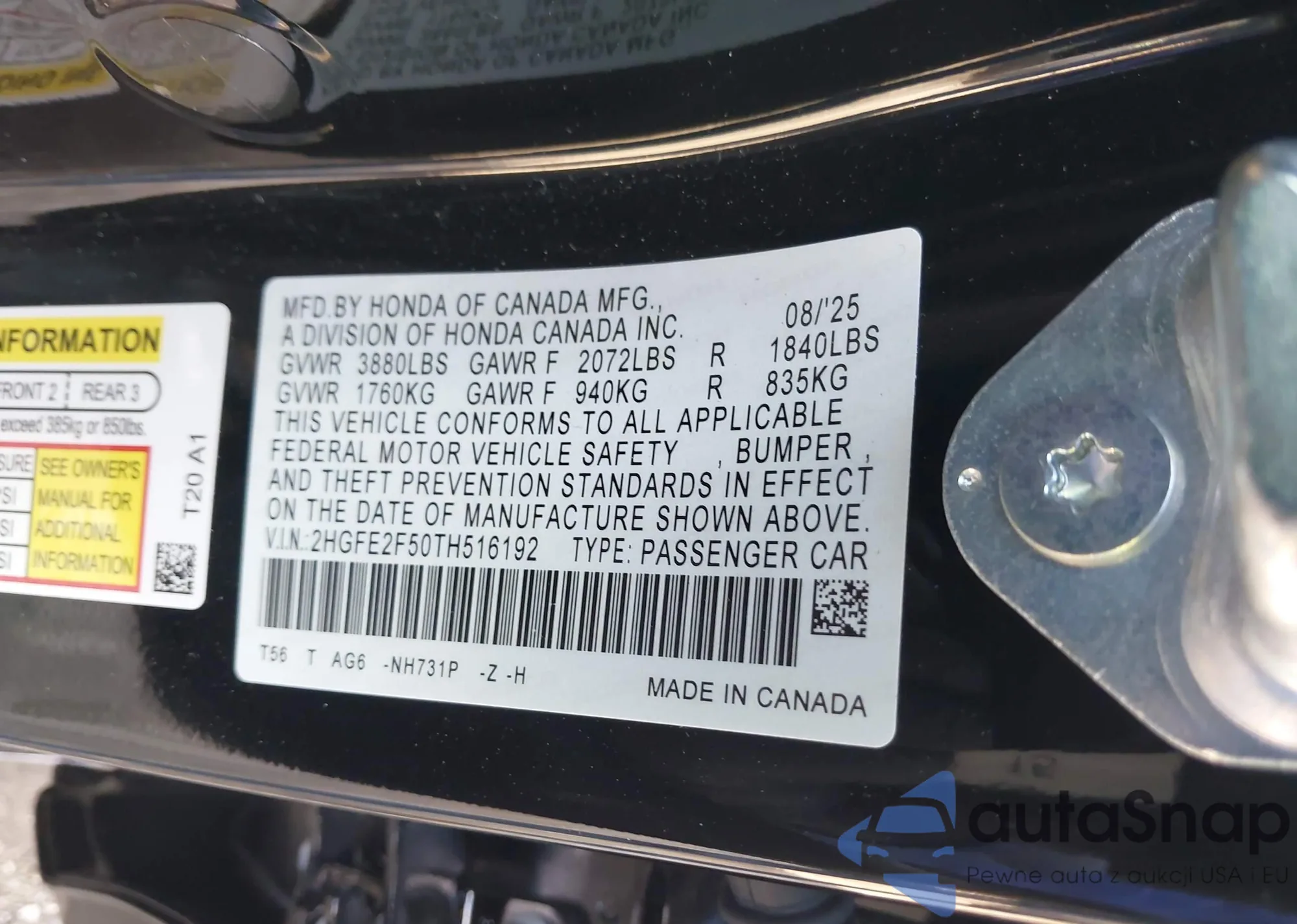 LOT: 43583472 VIN: 2HGFE2F50TH516192