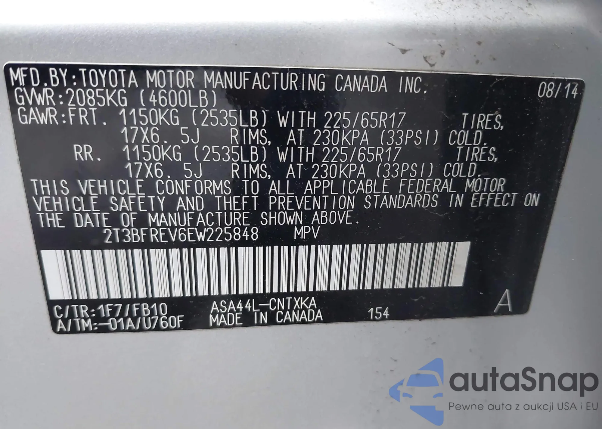 • VIN 2T3BFREV6EW225848