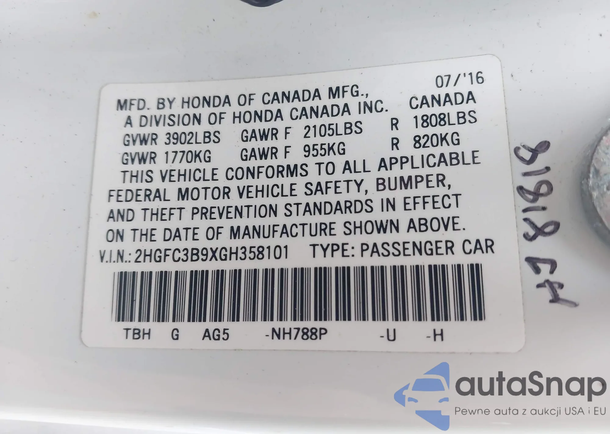 • VIN 2HGFC3B9XGH358101