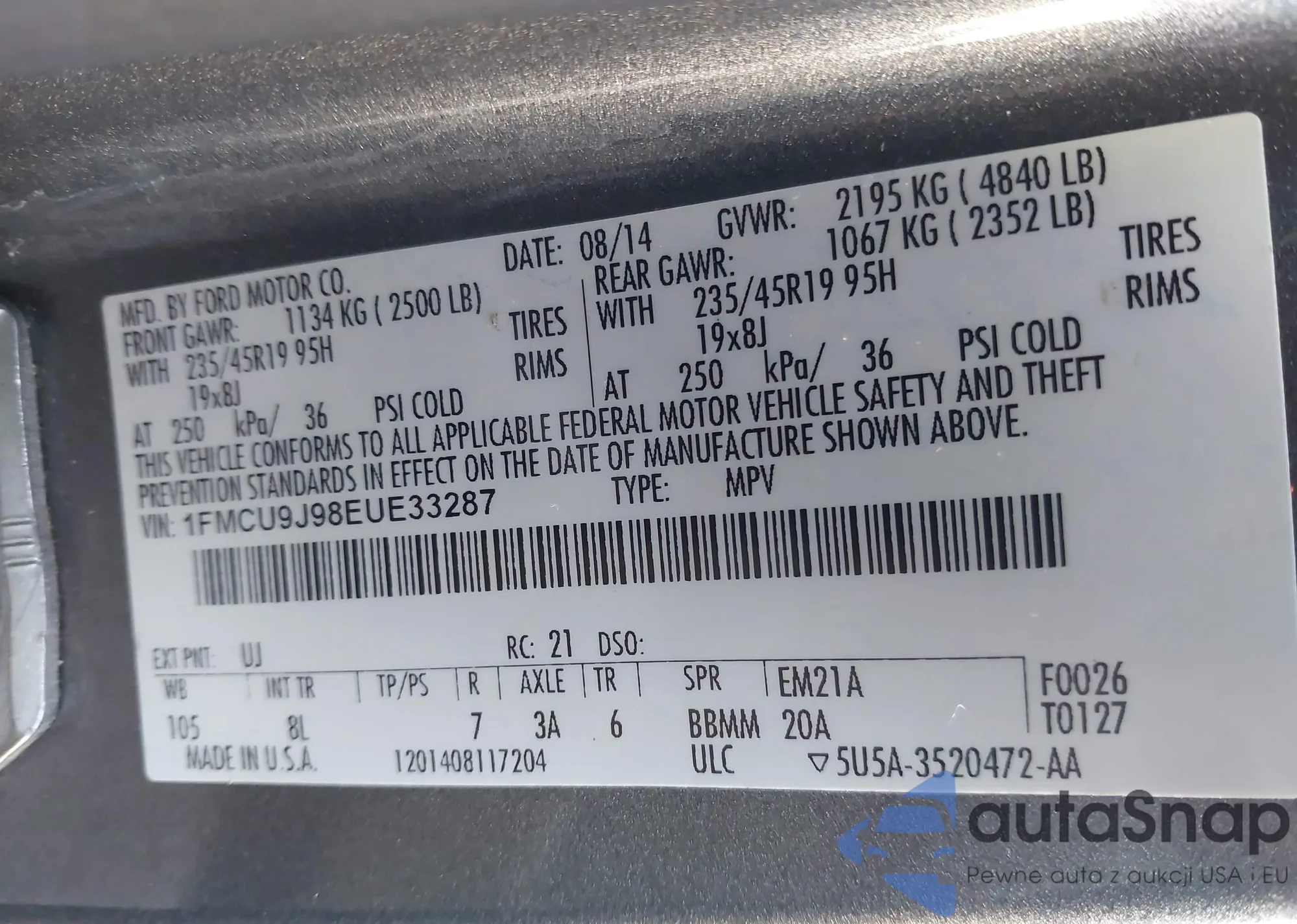 LOT: 43794927 VIN: 1FMCU9GX4EUC18351
