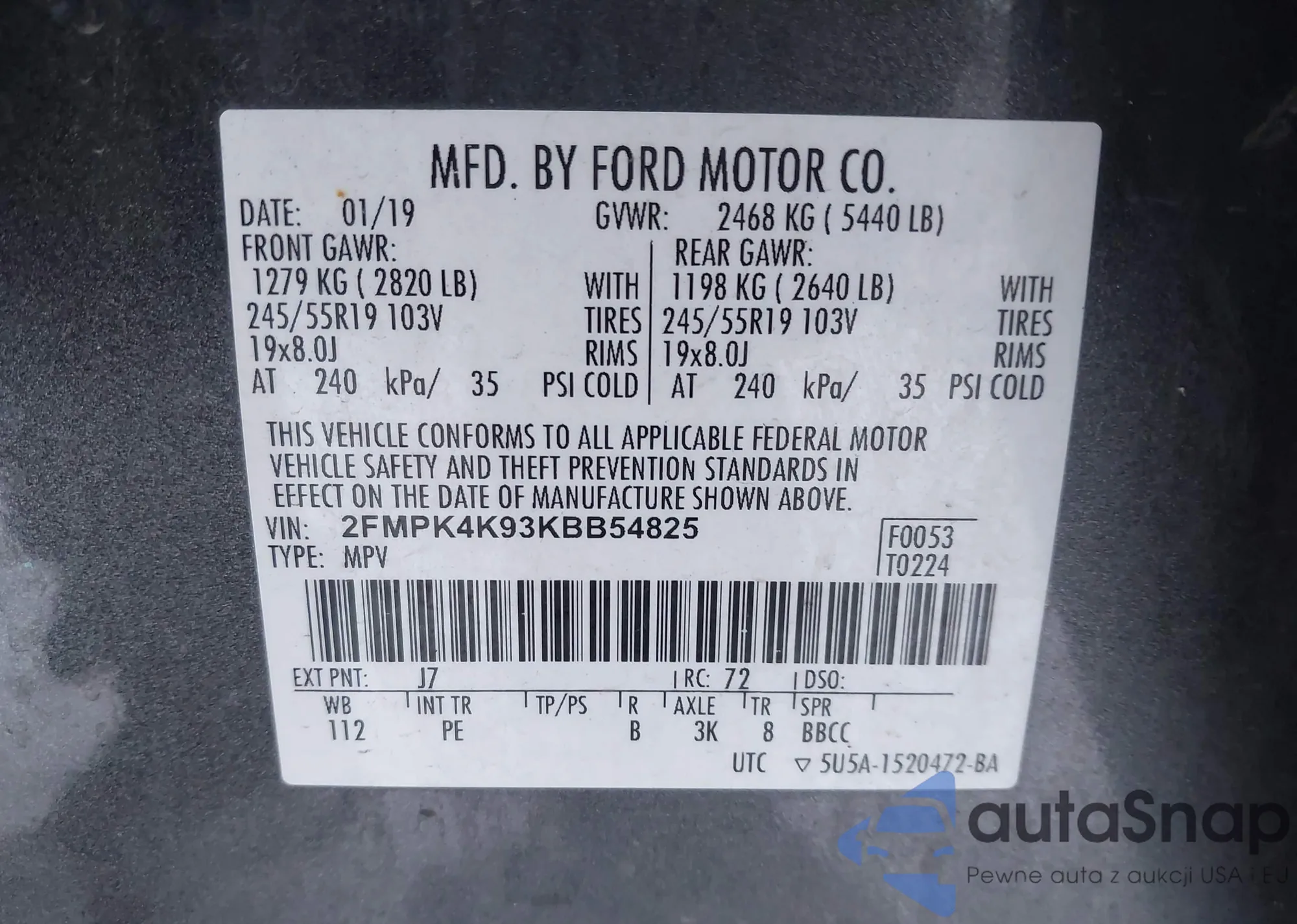 LOT: 43914224 VIN: 2FMPK4K93KBB54825