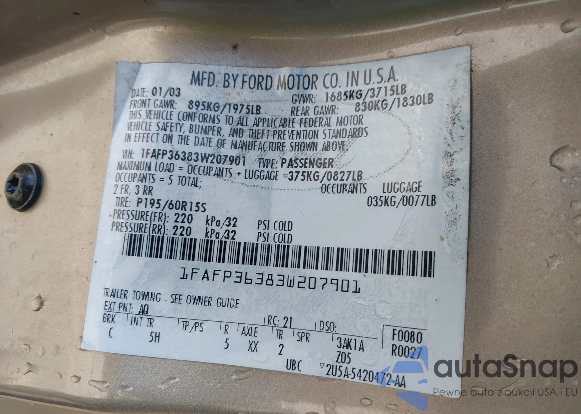 LOT: 44139916 VIN: 1FAFP36383W207901