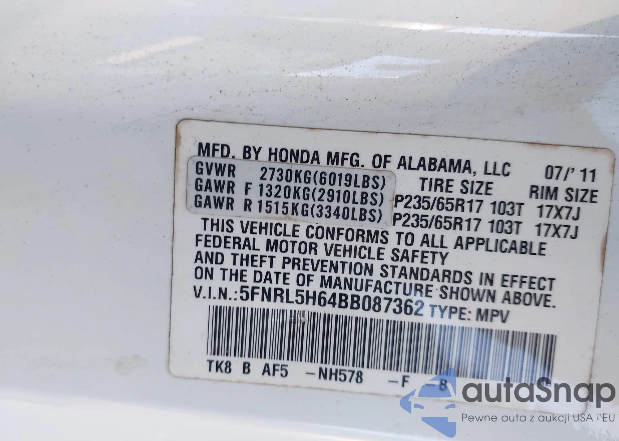 • VIN 5J6RE48599L027106
