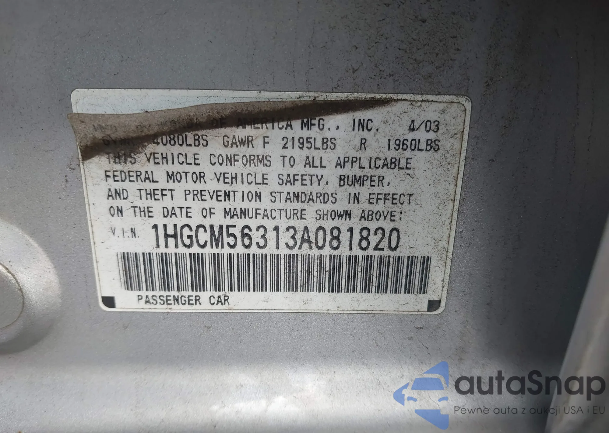 LOT: 44160766 VIN: 1HGCM56313A081820