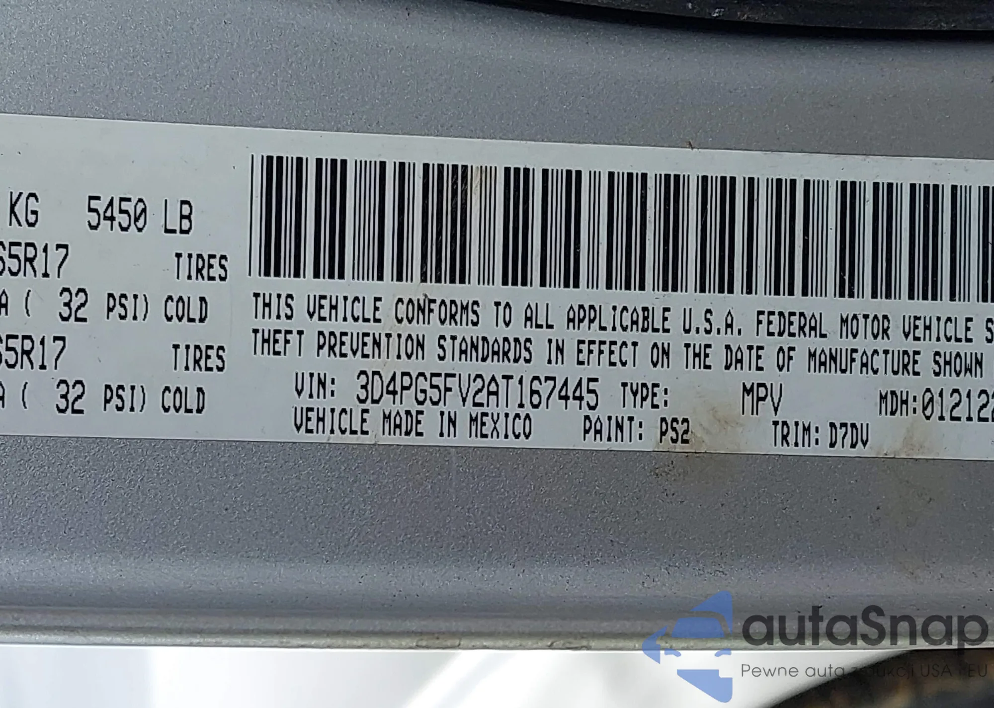 LOT: 43994499 VIN: 3D4PG5FV2AT167445