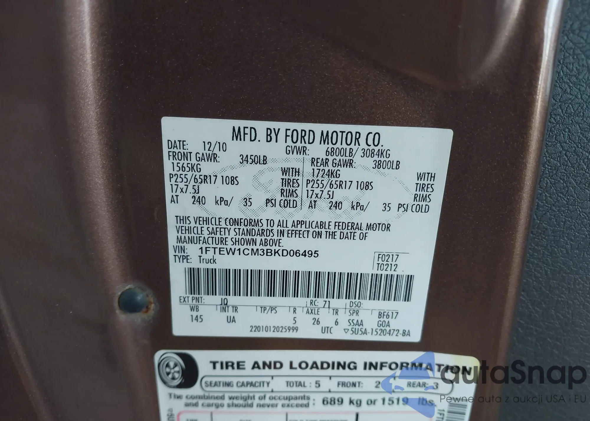 • VIN 1FTEW1CM3BKD06495