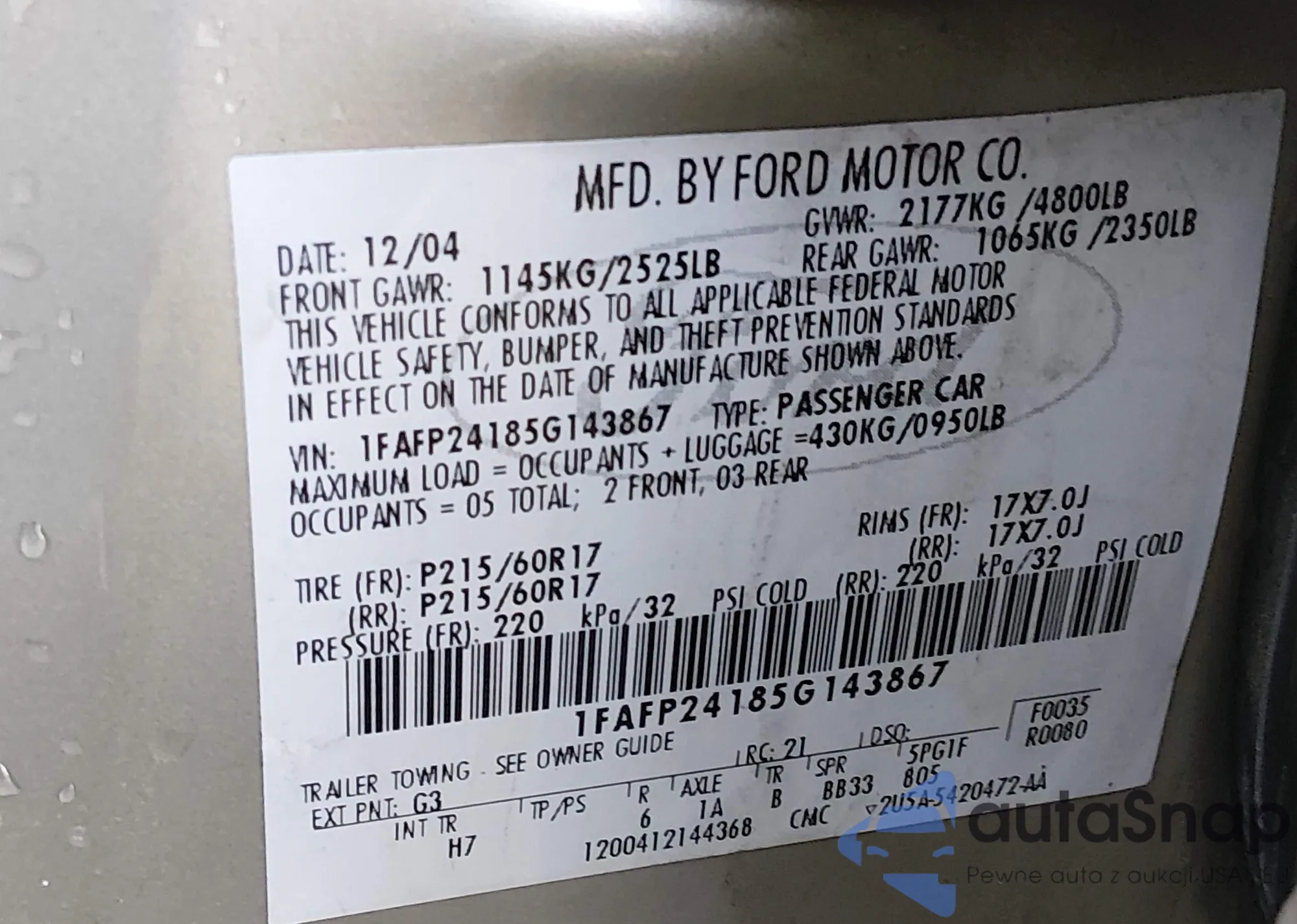• VIN 1FAFP24185G143867
