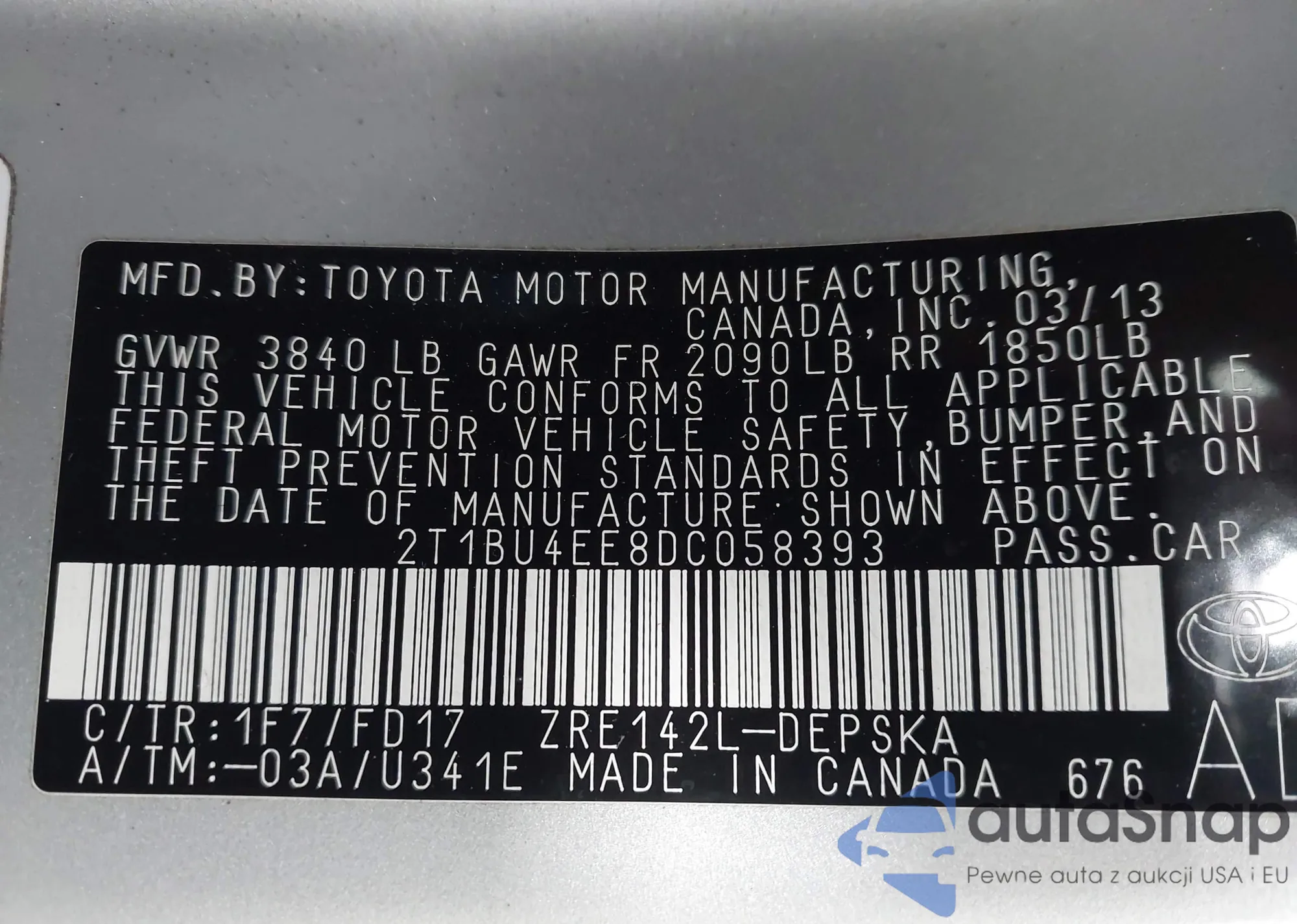 LOT: 44029013 VIN: 4T3BK3BB1DU086763