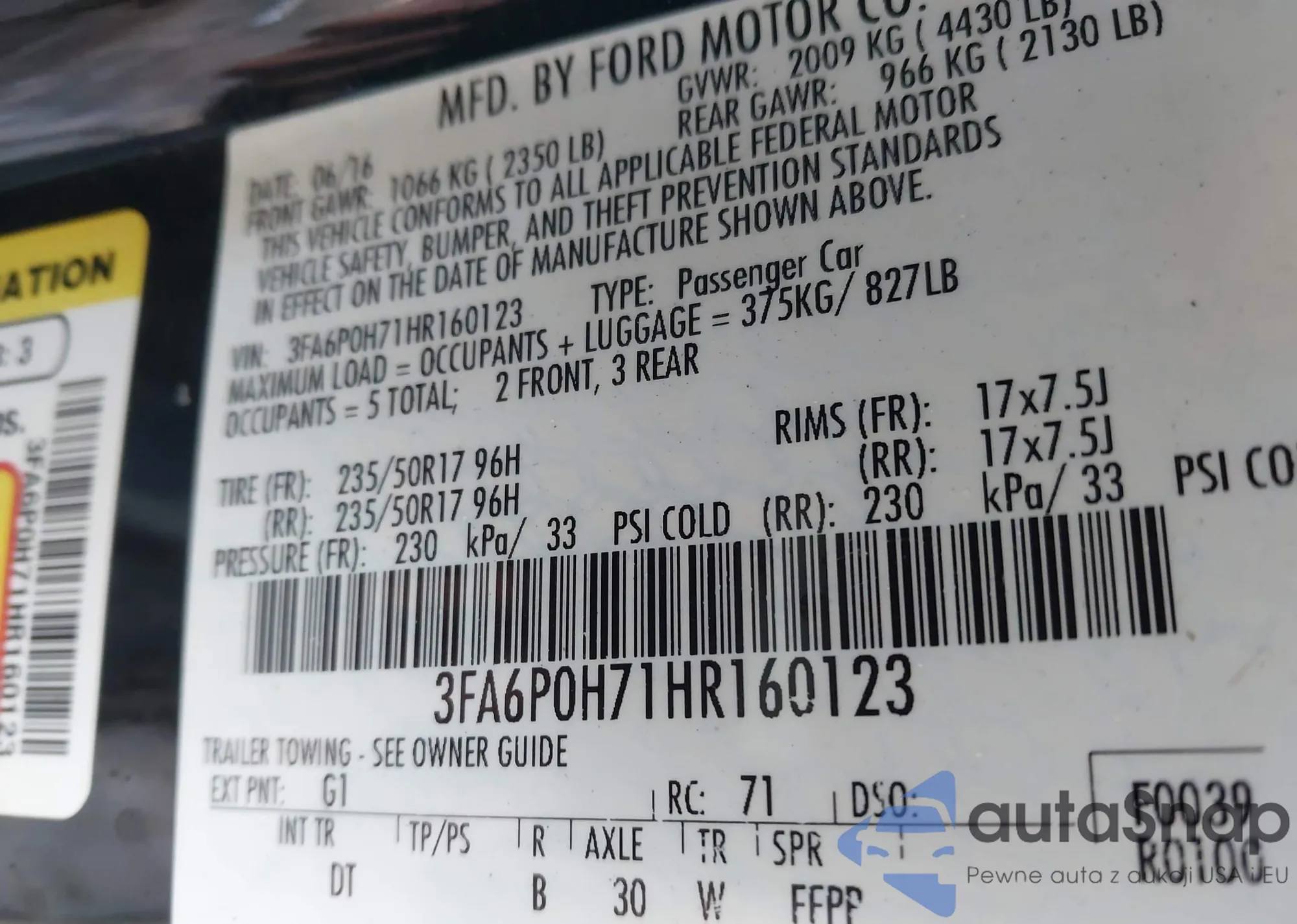 LOT: 43952437 VIN: 3FA6P0H71HR160123