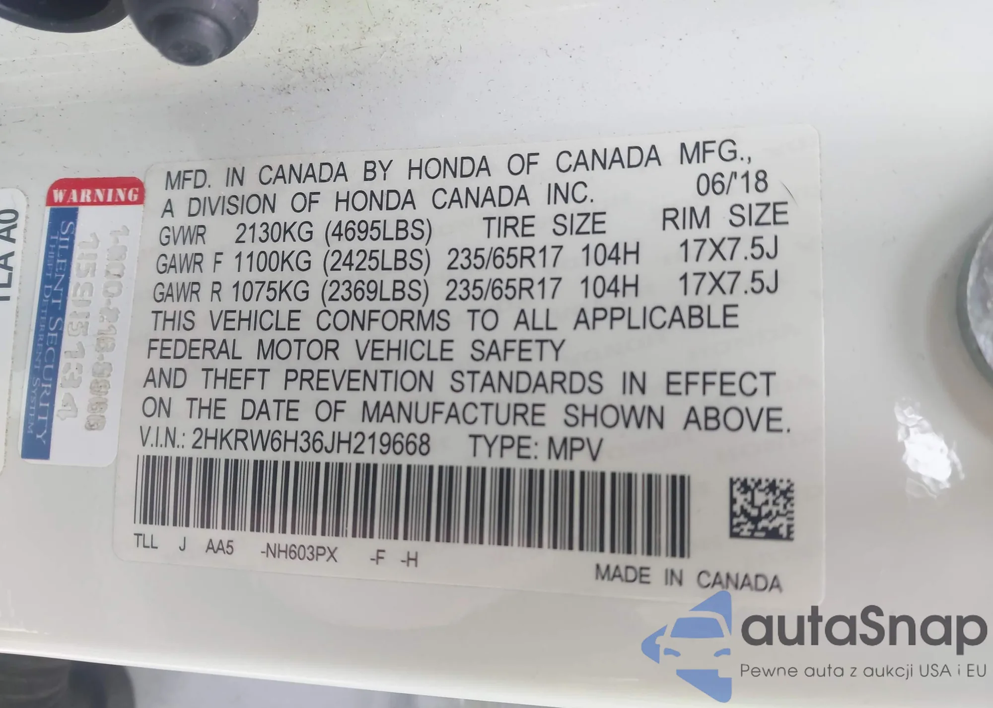 • VIN 2HKRW6H36JH219668