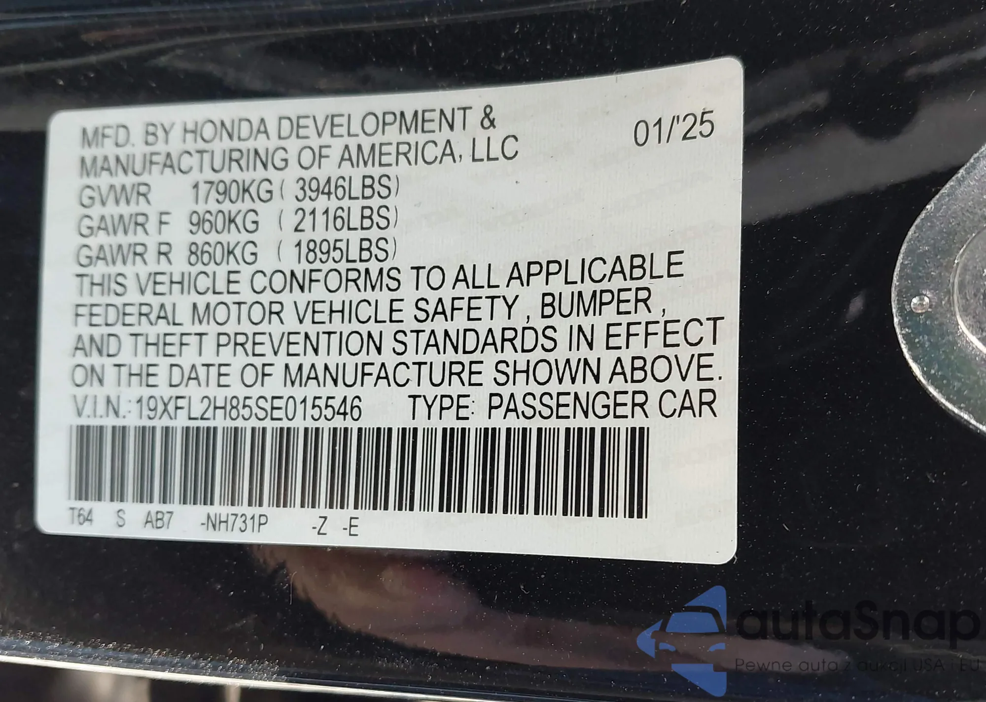 • VIN 19XFL2H85SE015546