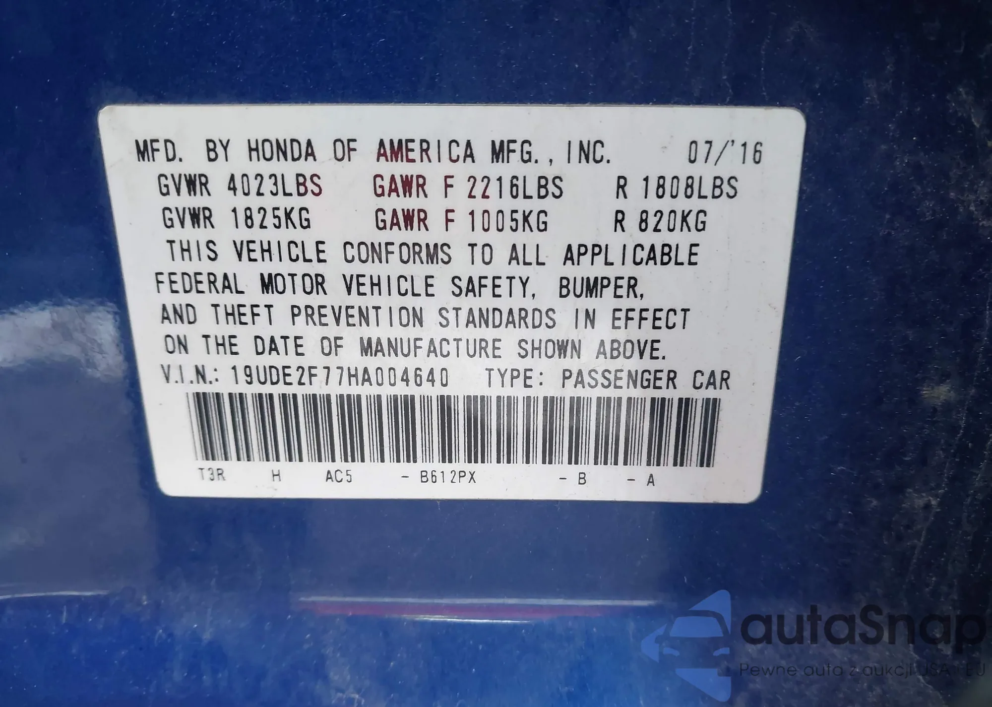 • VIN 19UDE2F77HA004640