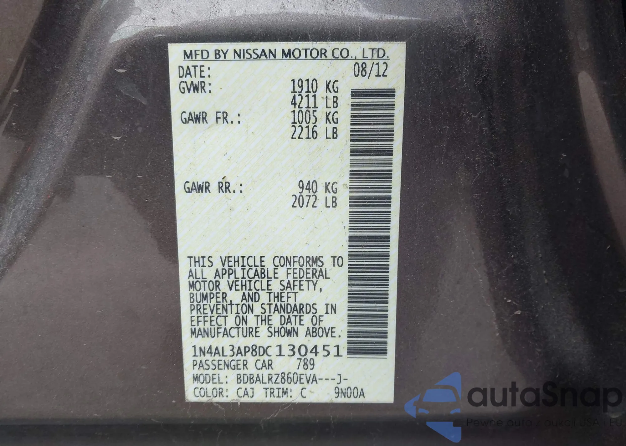 • VIN 1N4AL3AP8DC130451