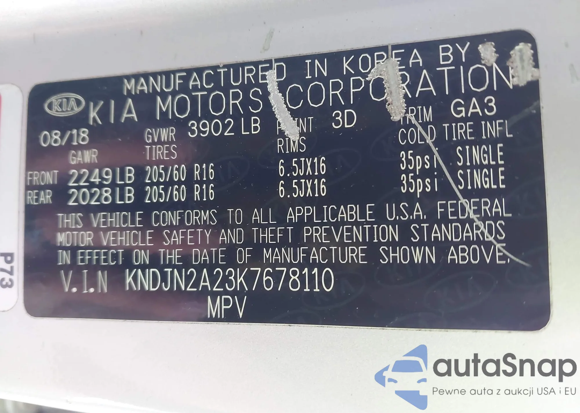 LOT: 43503339 VIN: KNDJN2A23K7678110