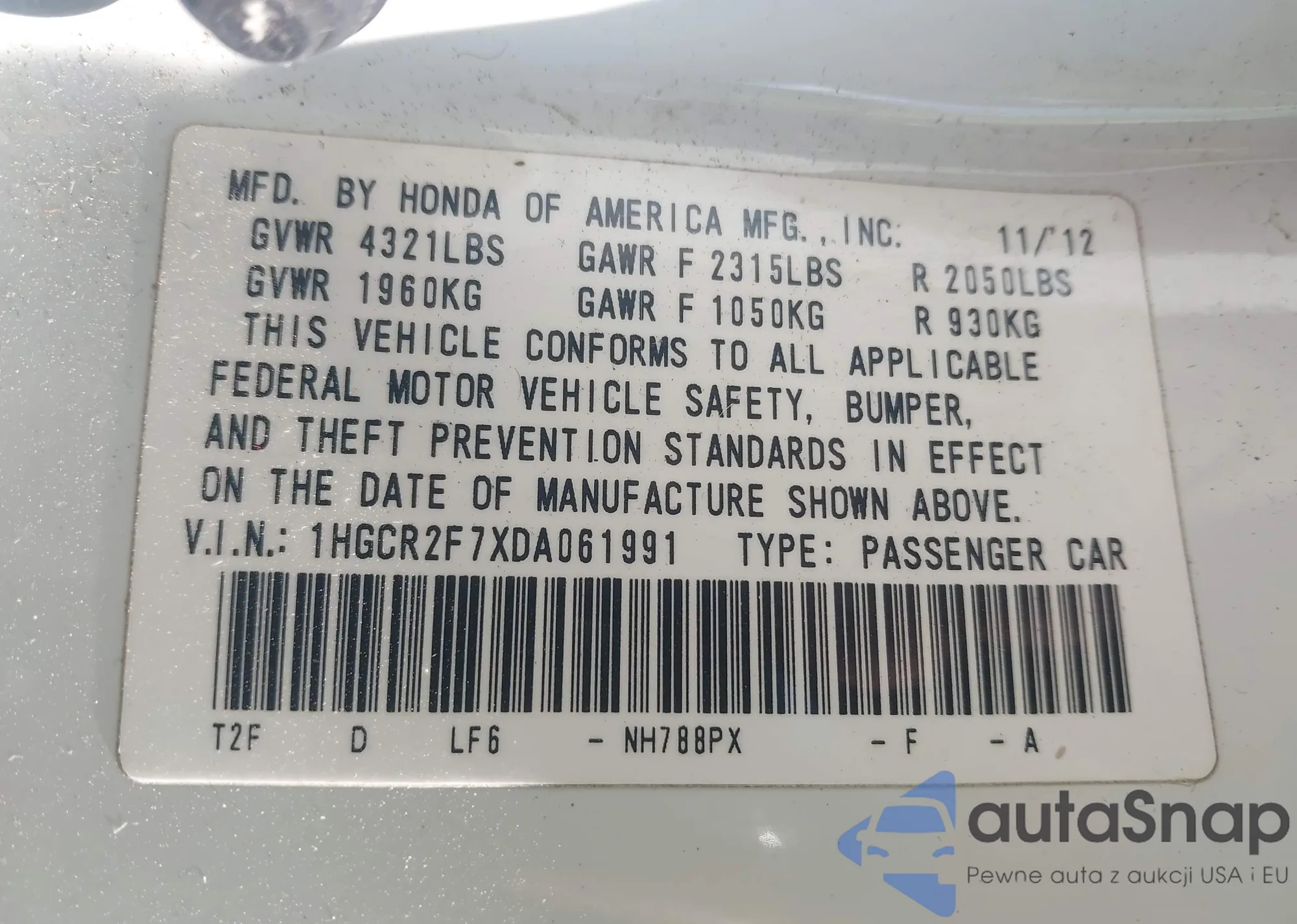 • VIN 1HGCR2F7XDA061991