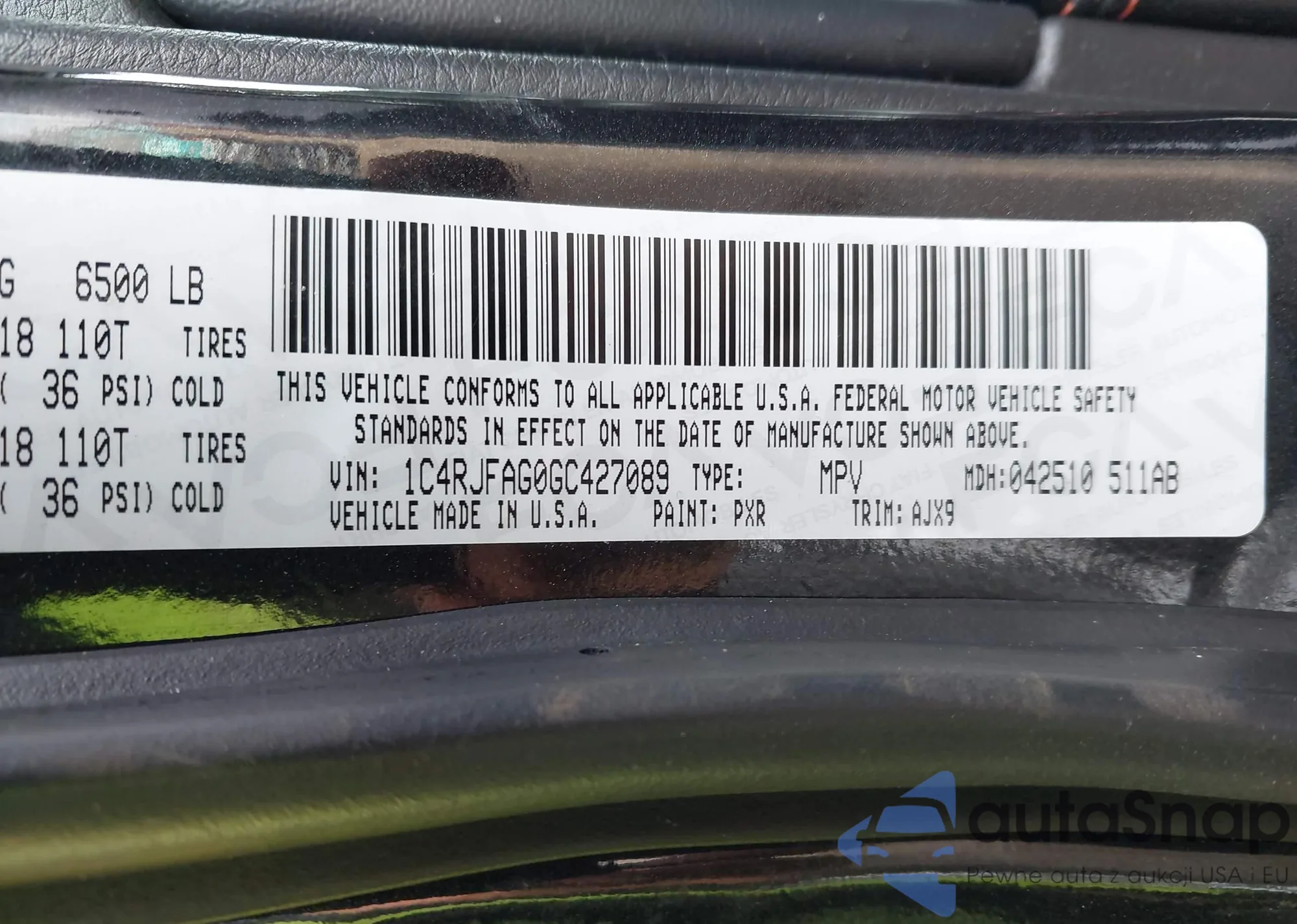 • VIN 1C4RJFAG0GC427089