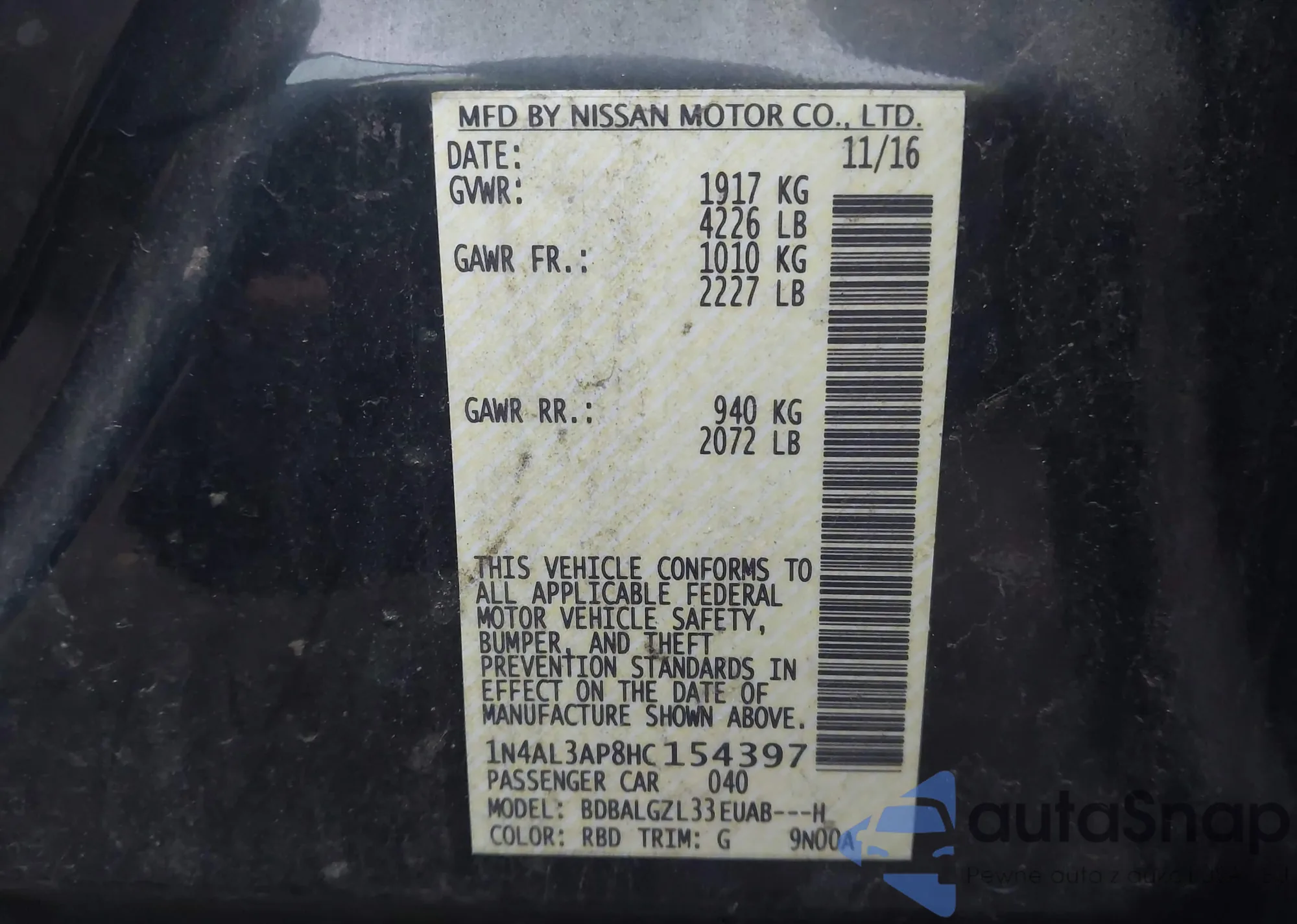 • VIN 1N4AL3AP8HC154397