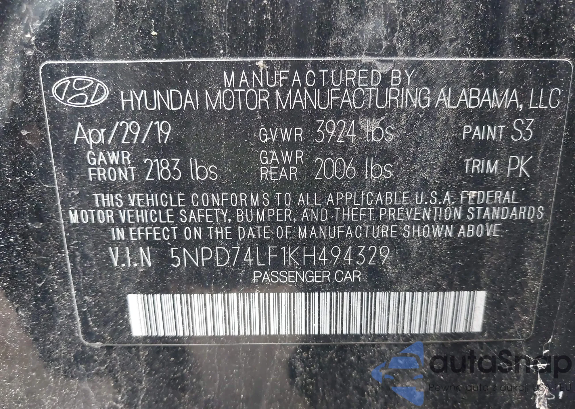 LOT: 44241747 VIN: 5NPD74LF1KH494329