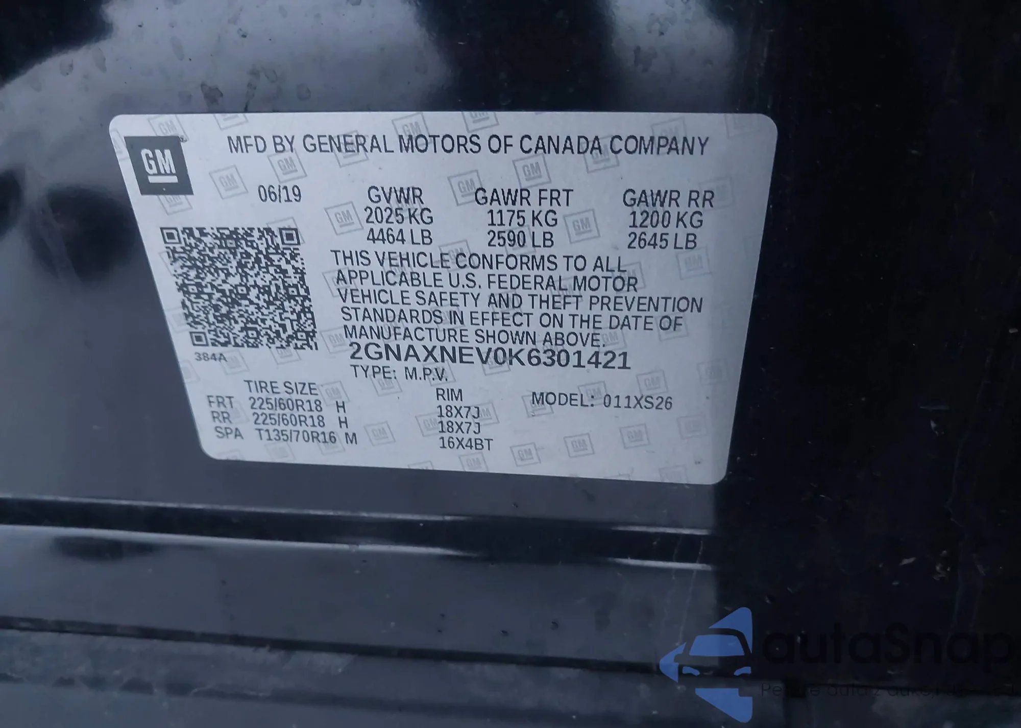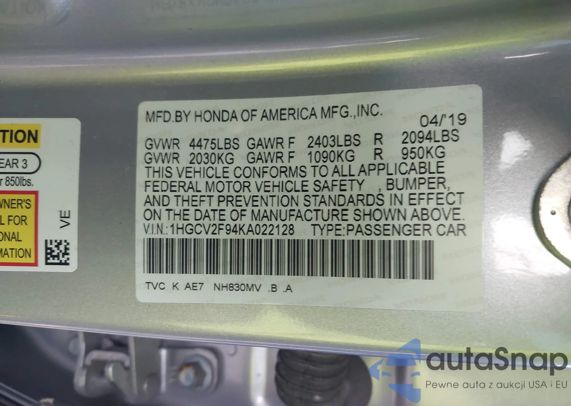 LOT: 43840019 VIN: 1HGCV2F94KA022128
