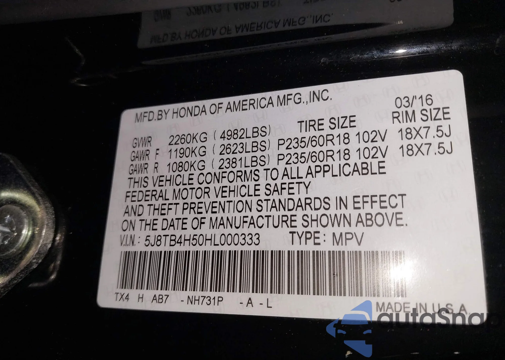 • VIN 5J8TB4H50HL000333