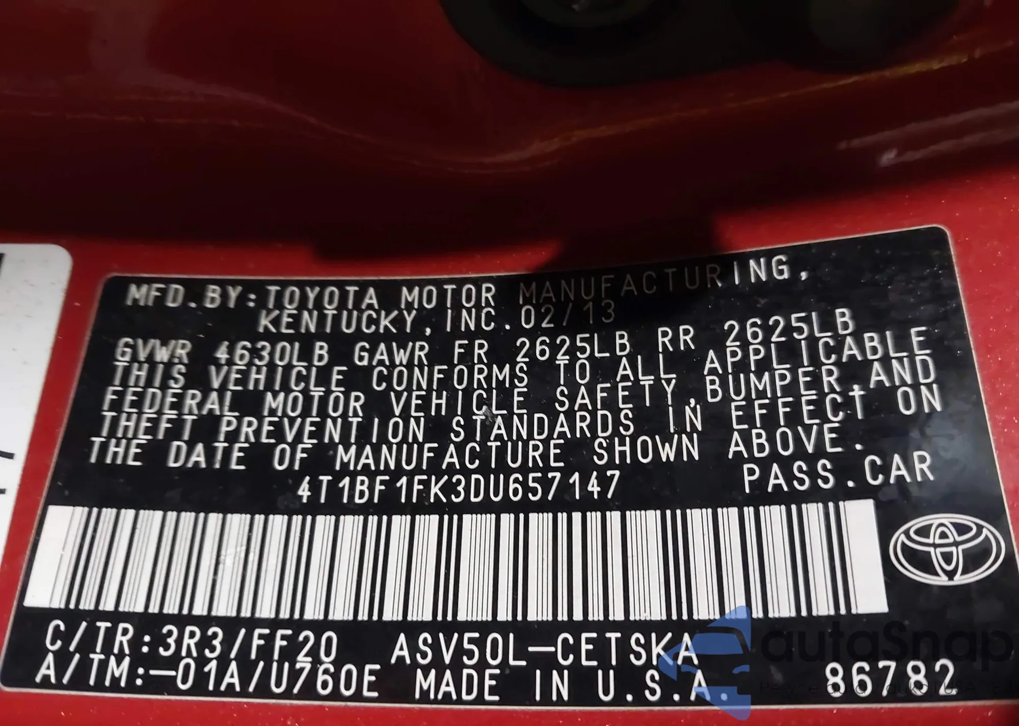 • VIN 4T1BF1FK3DU657147