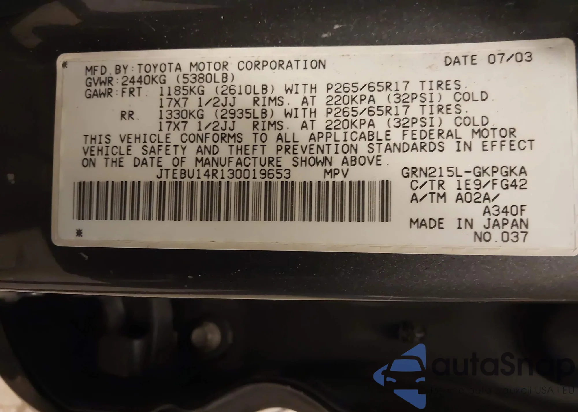 LOT: 44309917 VIN: JTEBU14R130019653
