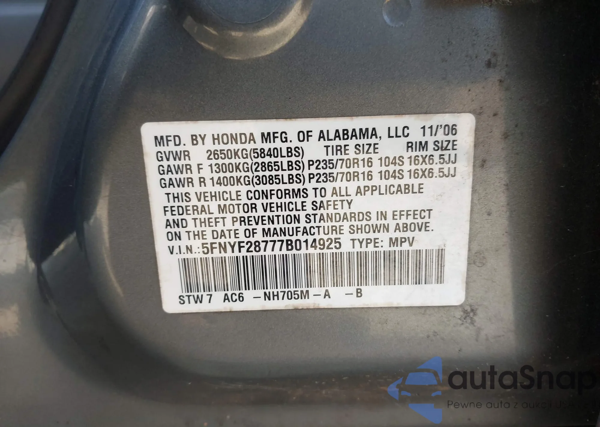 LOT: 43758228 VIN: 5FNYF28777B014925