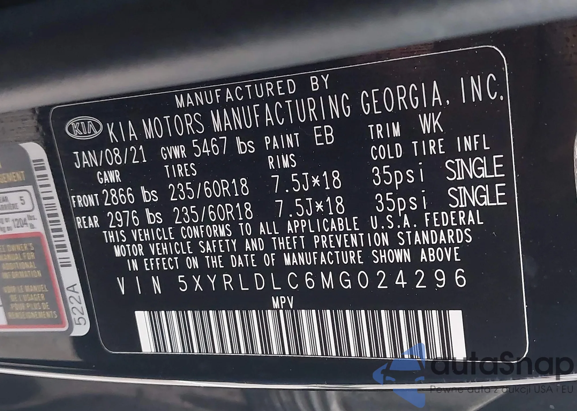 • VIN 5XYRLDLC6MG024296