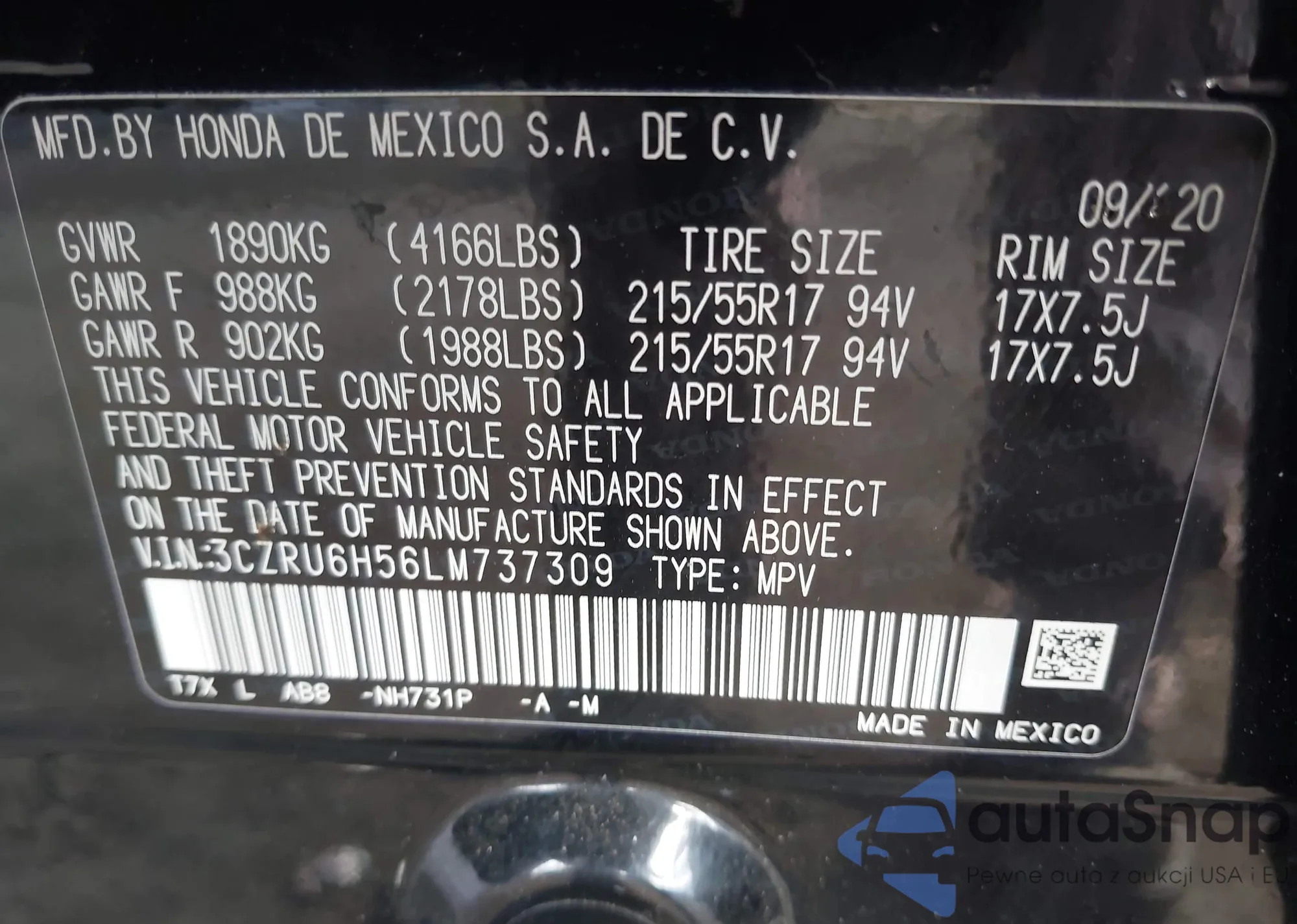 • VIN 2HKRM3H35FH502347