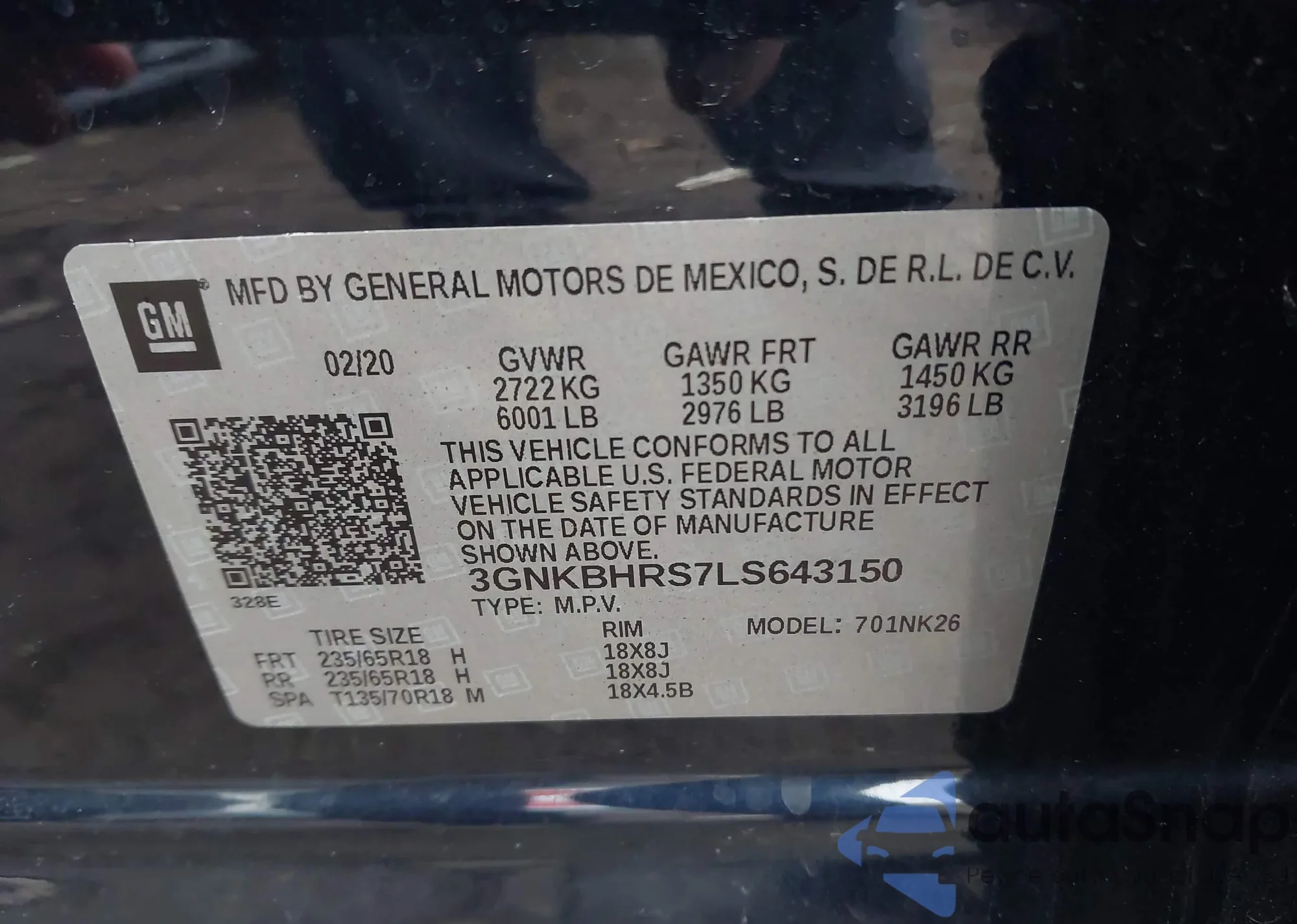 • VIN 3GNKBHRS7LS643150