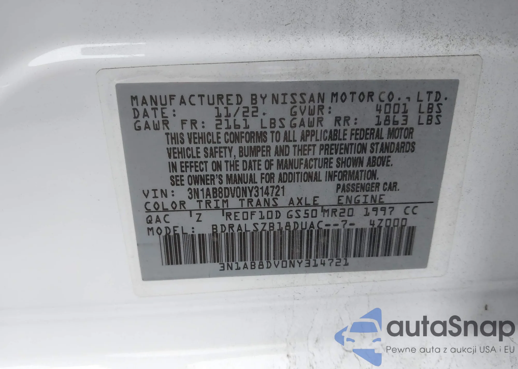 • VIN 3N1AB8DV0NY314721