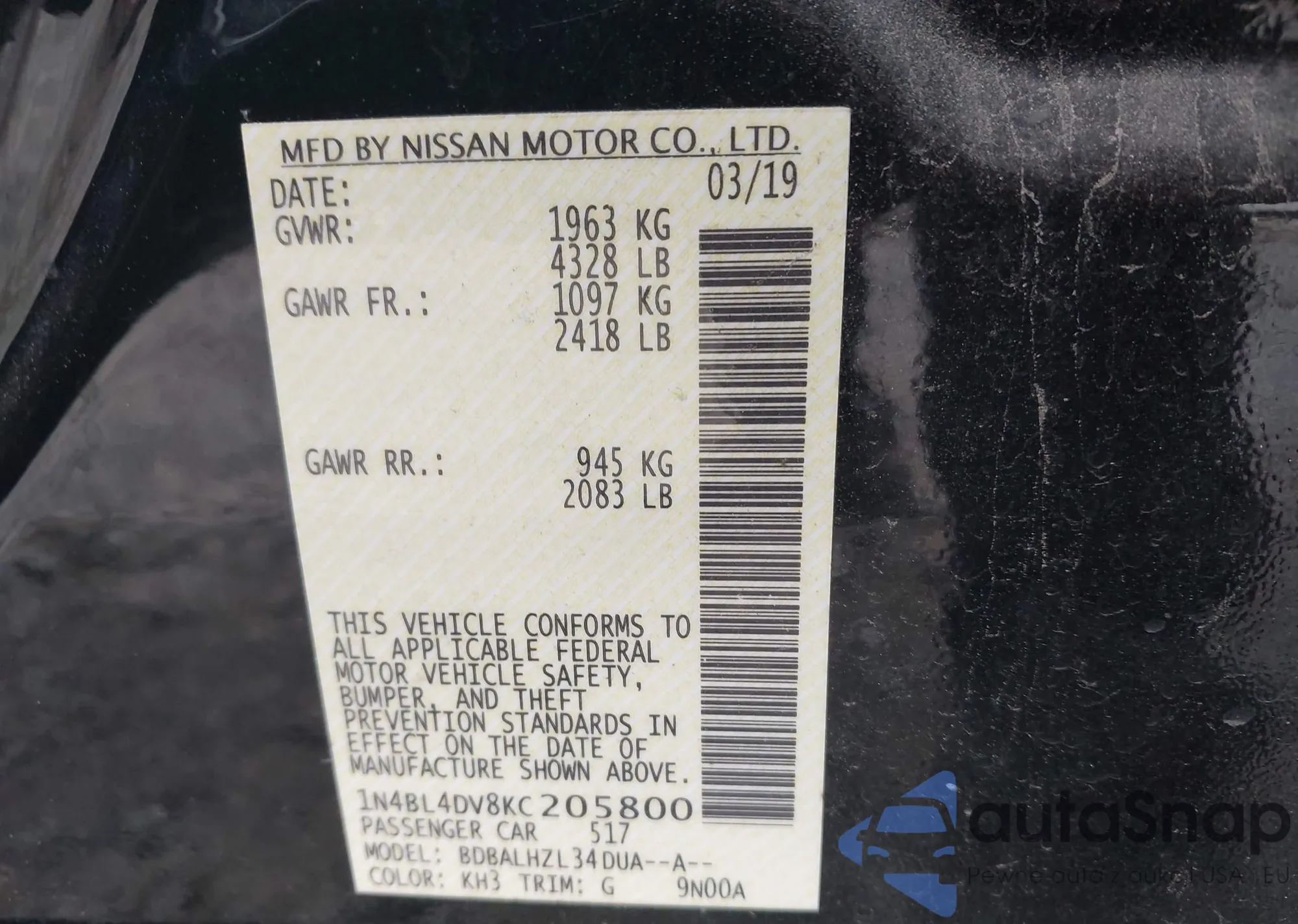 • VIN 1N4BL4DV8KC205800
