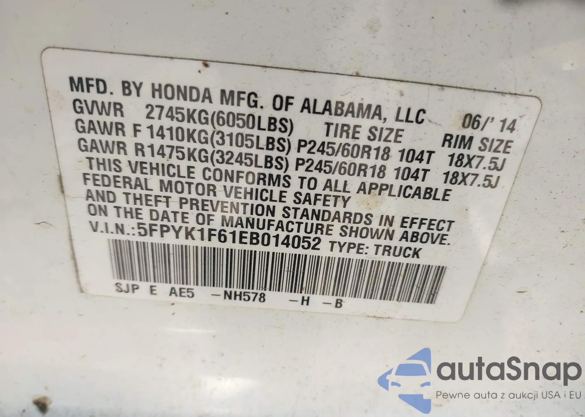 • VIN 5FPYK1F61EB014052