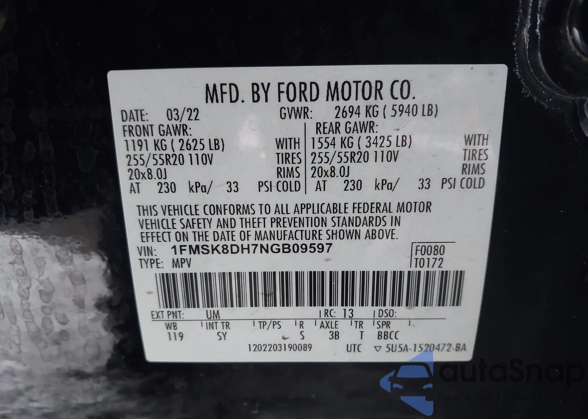 LOT: 43798487 VIN: 1FMSK8DH7NGB09597