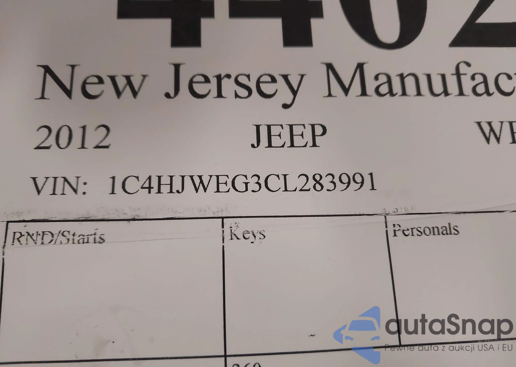 LOT: 44029063 VIN: 1C4HJWEG3CL283991