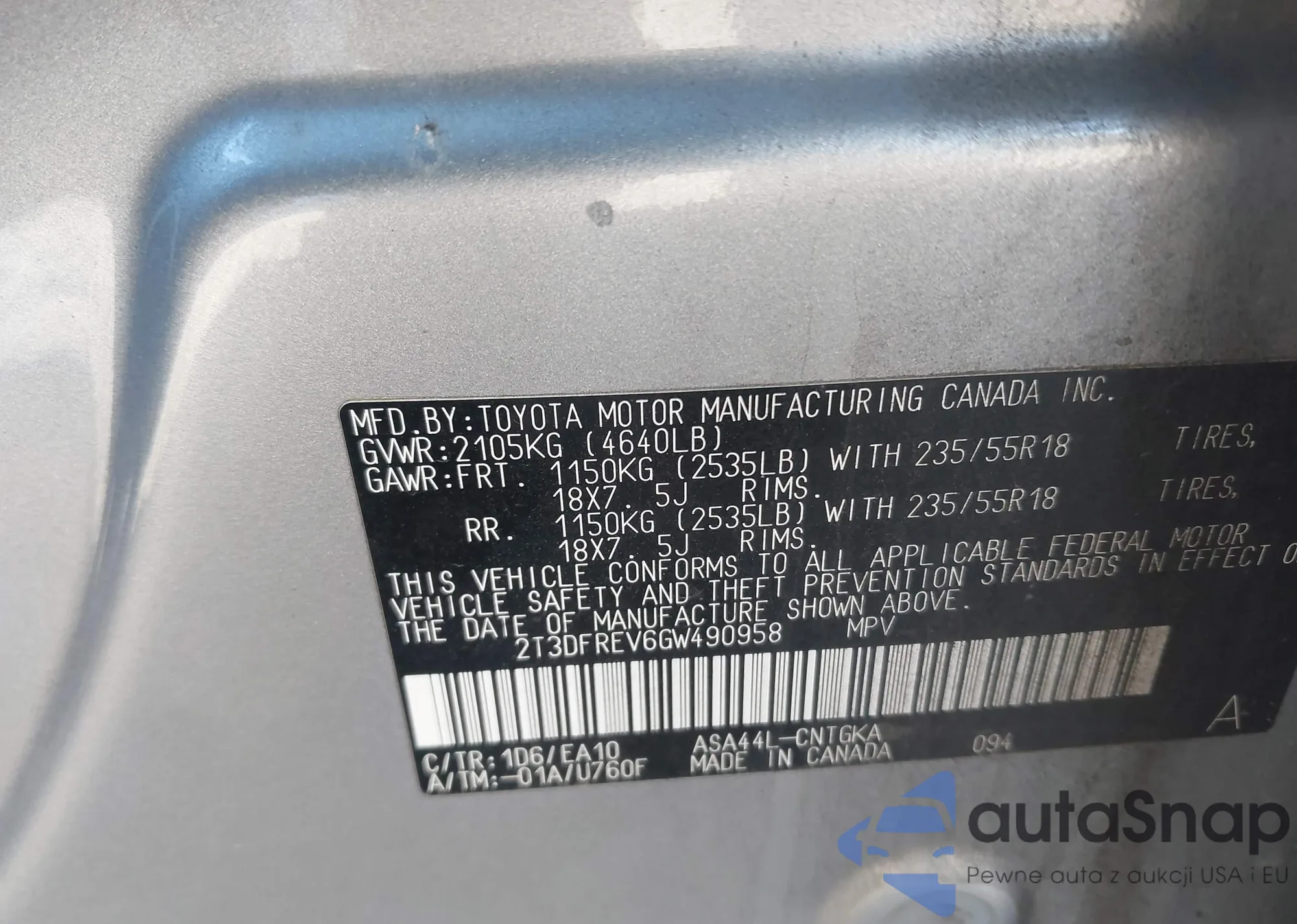 • VIN 2T3DFREV6GW490958