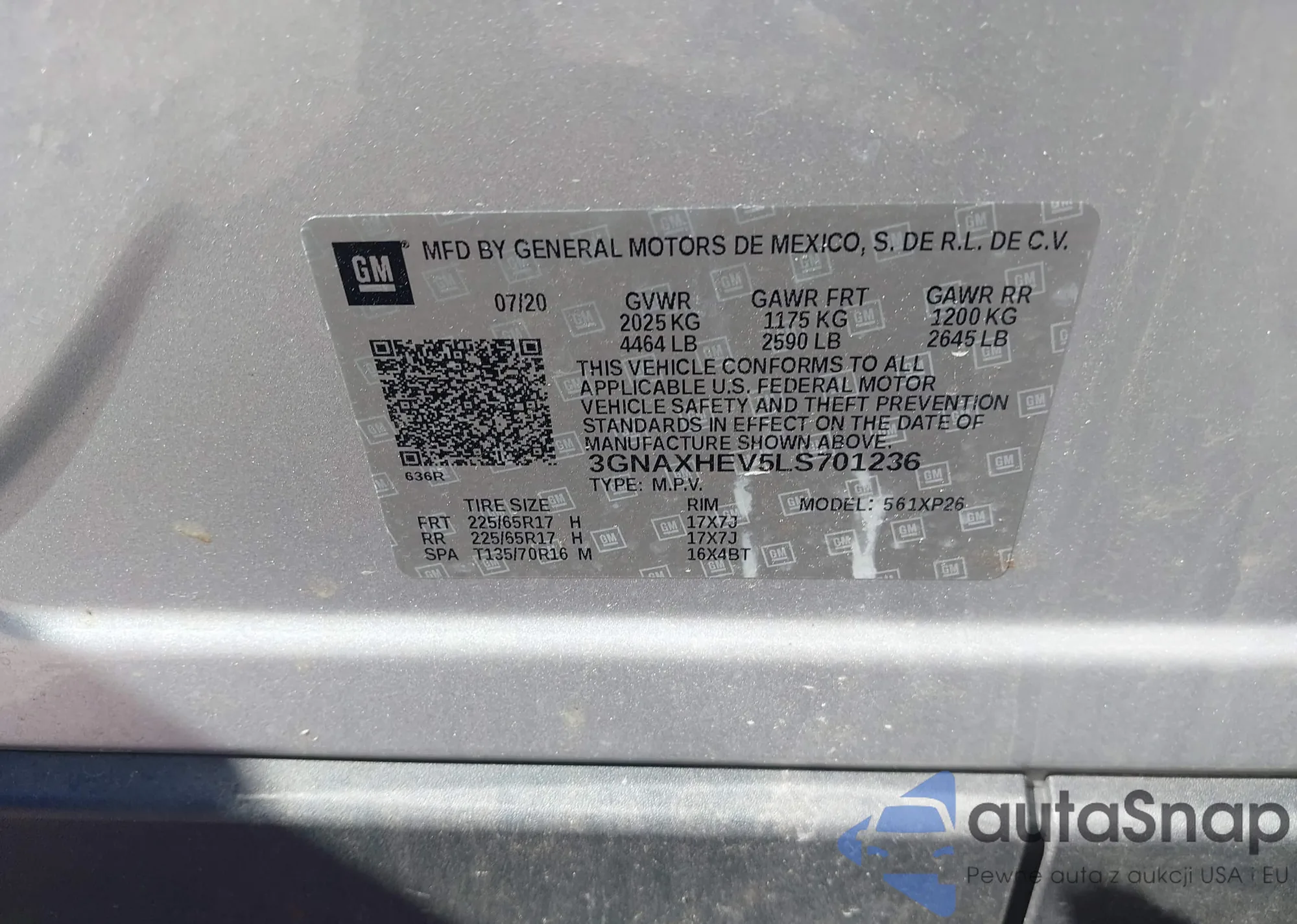 LOT: 43237312 VIN: 3GNAXHEV5LS701236
