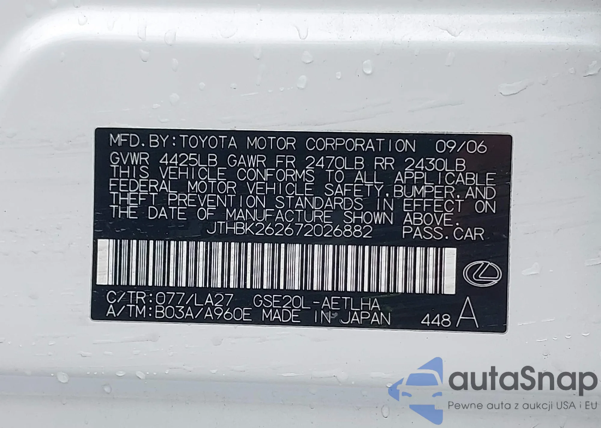 LOT: 42714742 VIN: JTHBK262672026882