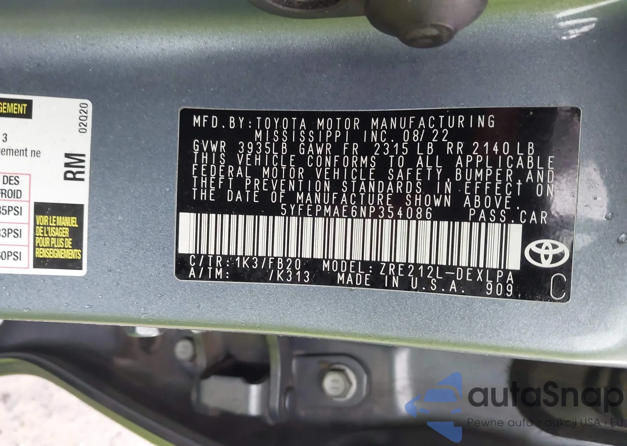 • VIN 5YFEPMAE6NP354086
