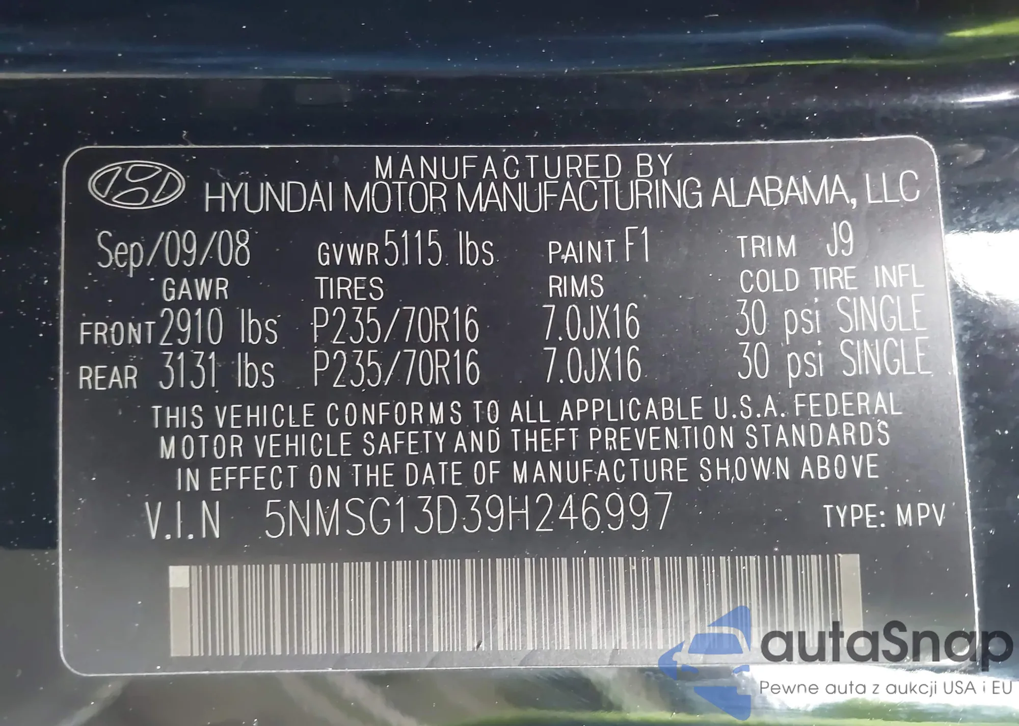 LOT: 44028806 VIN: 5NMSG13D39H246997