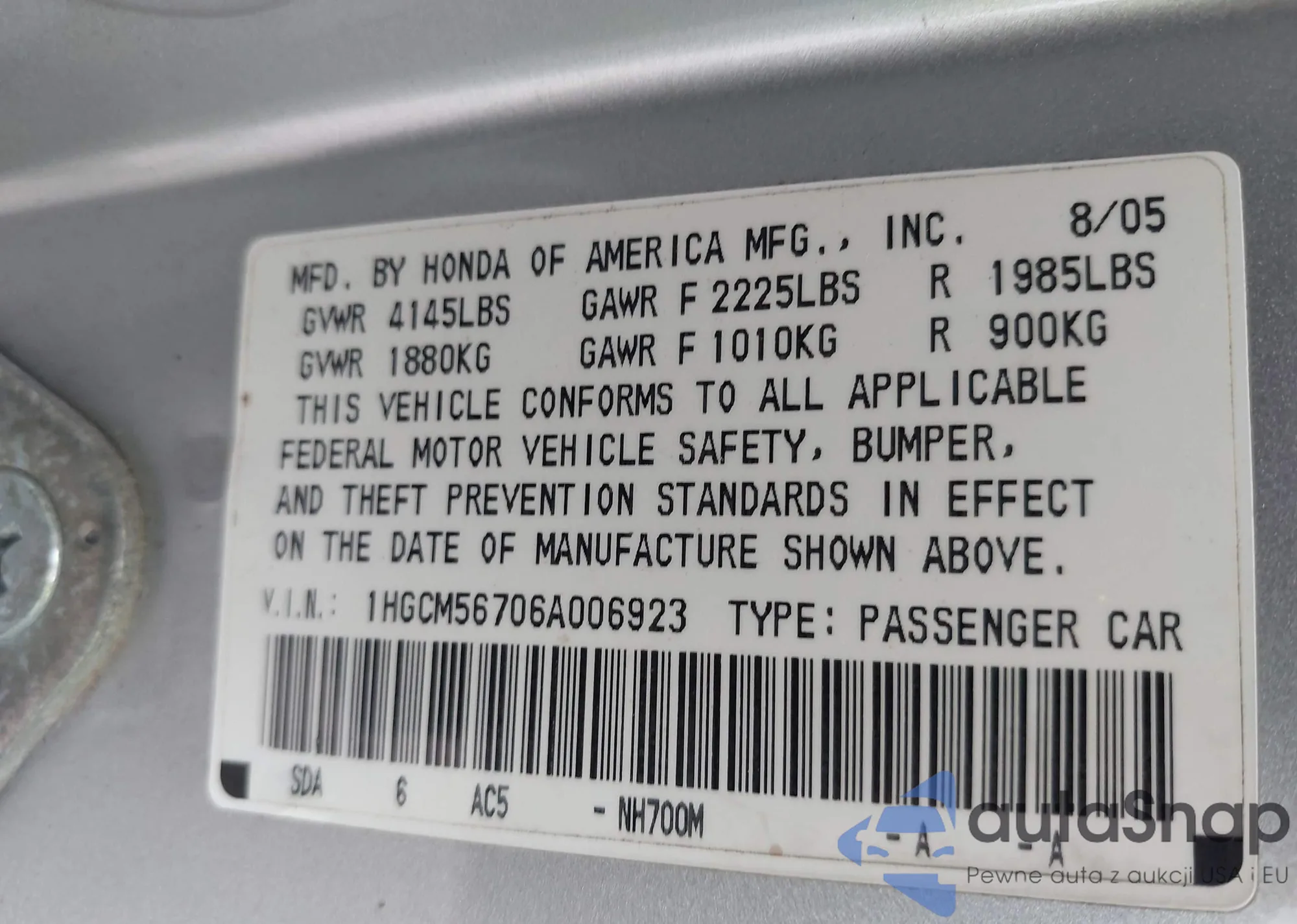 LOT: 44046392 VIN: 1HGCM56706A006923