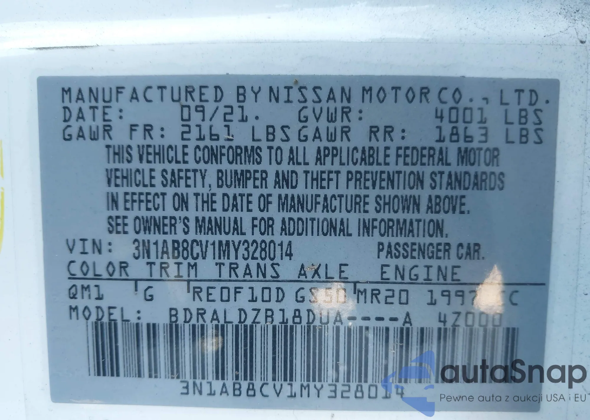 • VIN 3N1AB8CV1MY328014