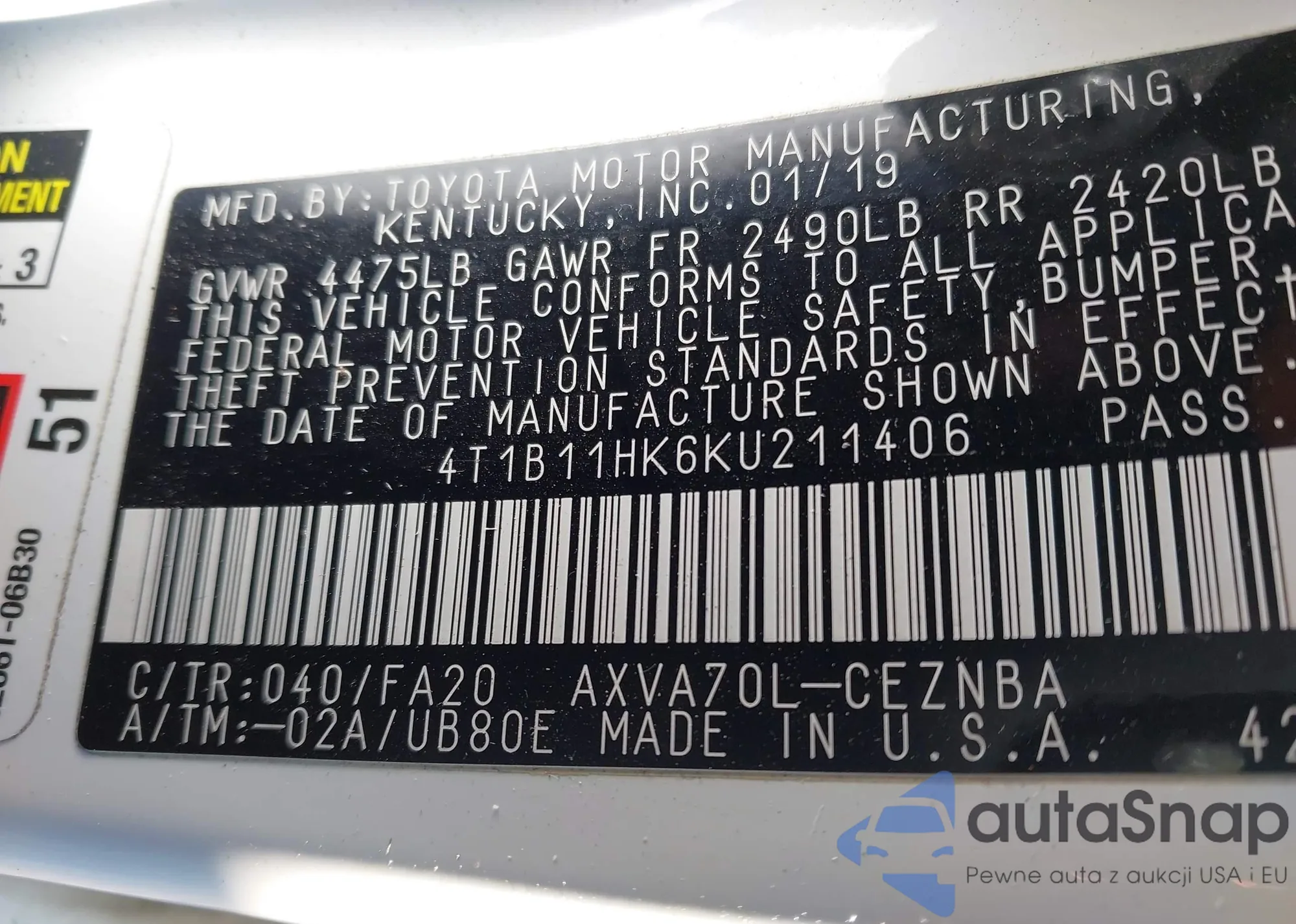 • VIN 4T1B11HK6KU211406