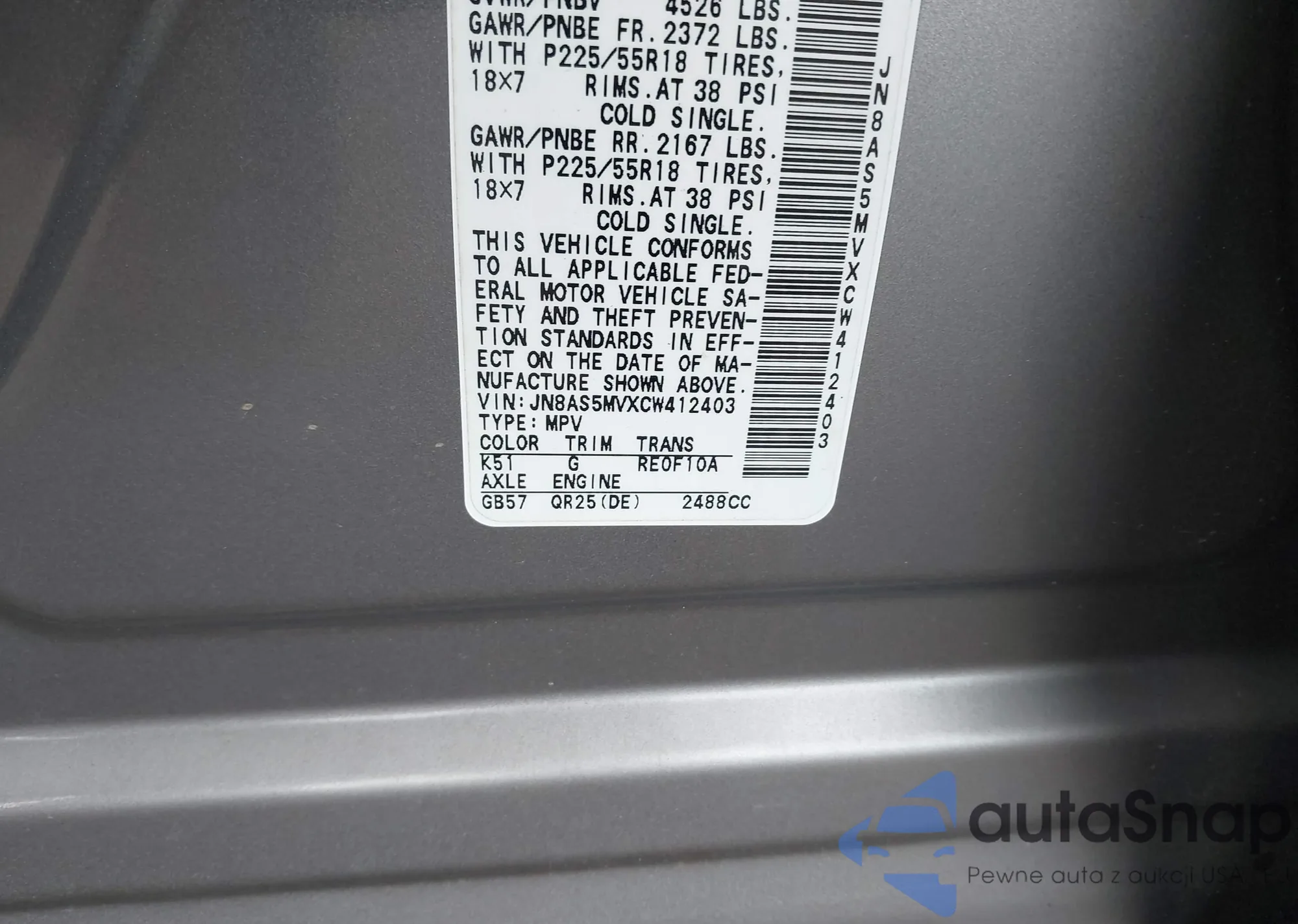 LOT: 44147080 VIN: JN8AS5MVXCW412403