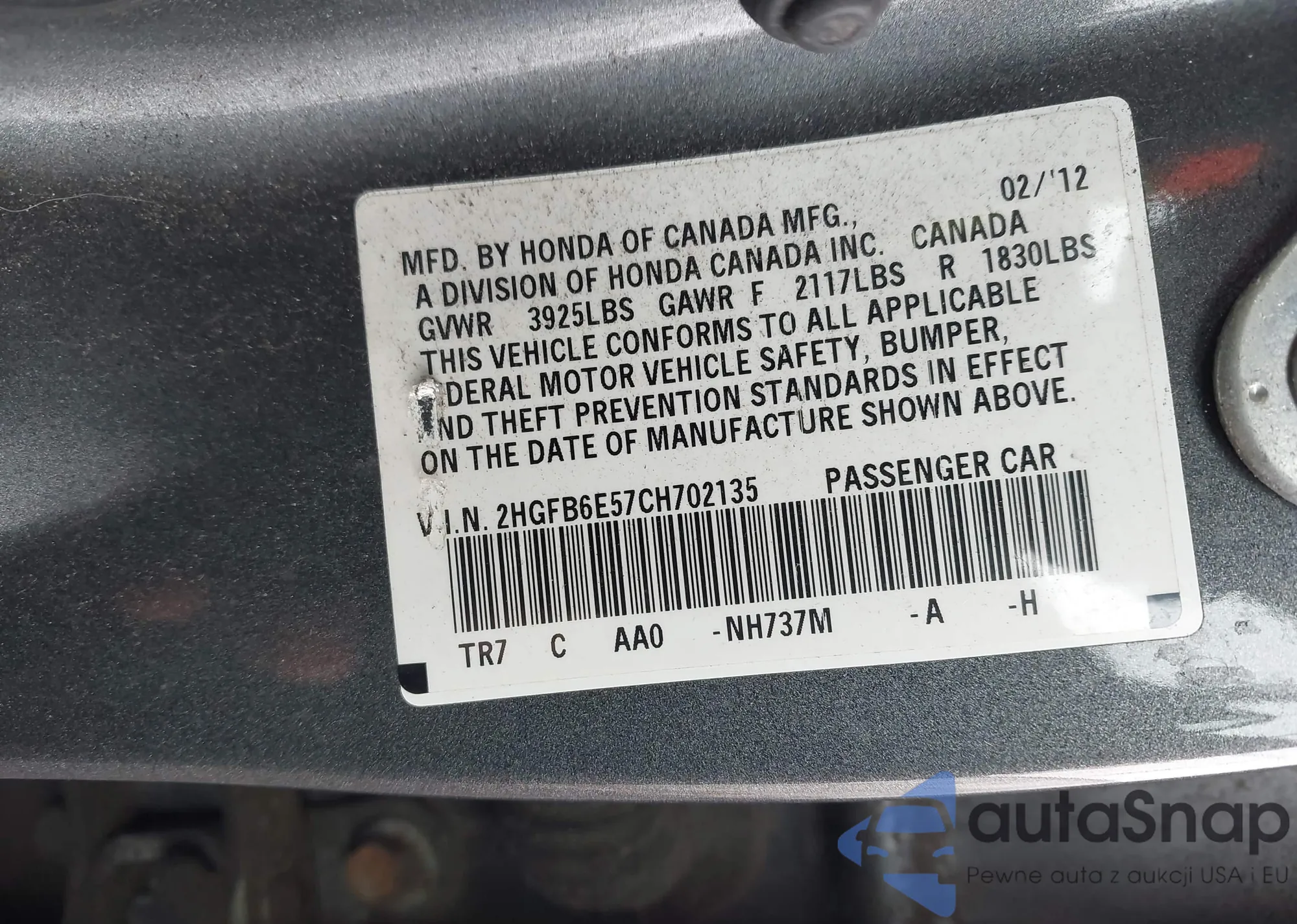 LOT: 44130053 VIN: 2HGFB6E57CH702135