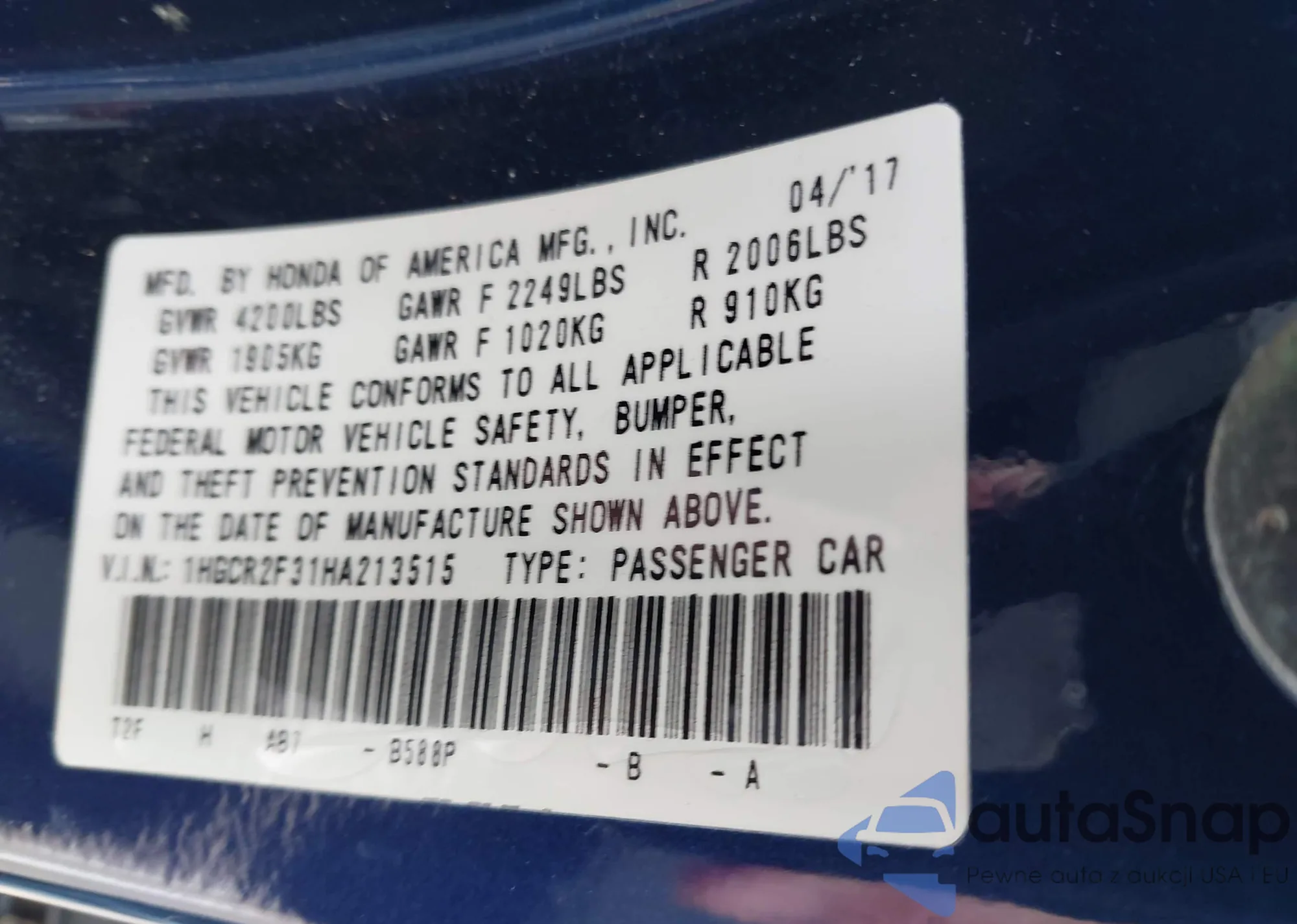 • VIN 1HGCR2F31HA213515