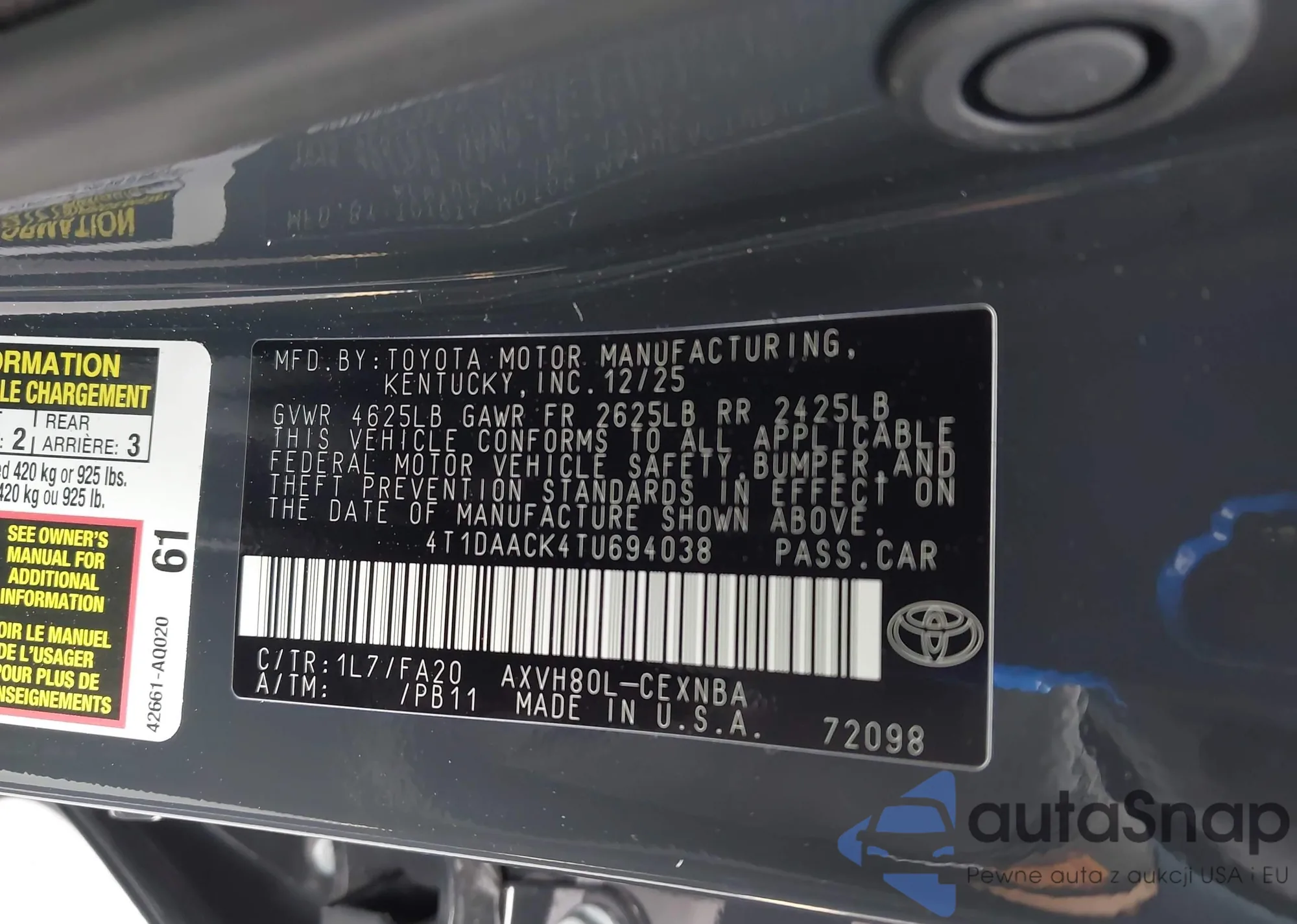 • VIN 4T1DAACK4TU694038