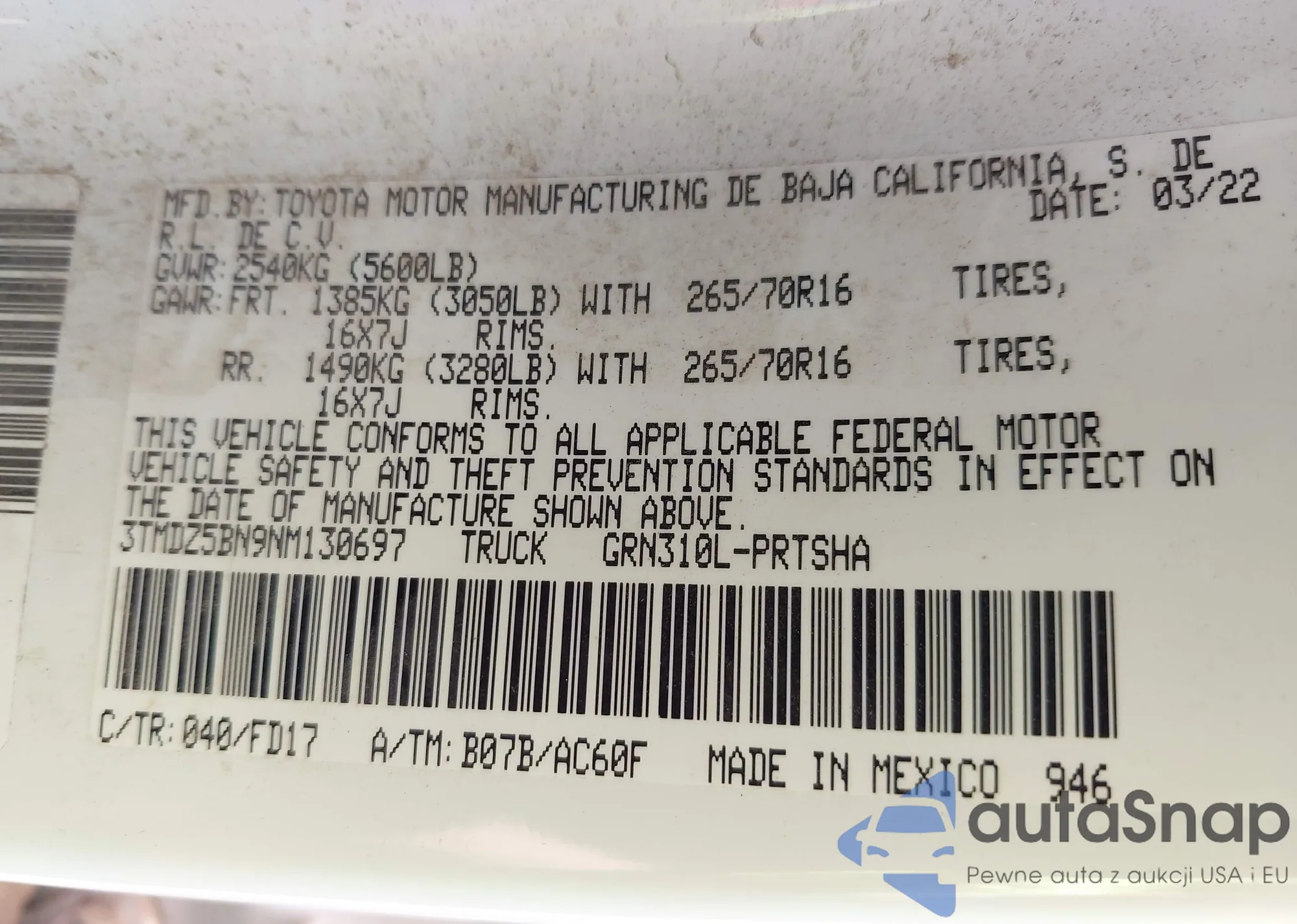• VIN 3TMDZ5BN9NM130697