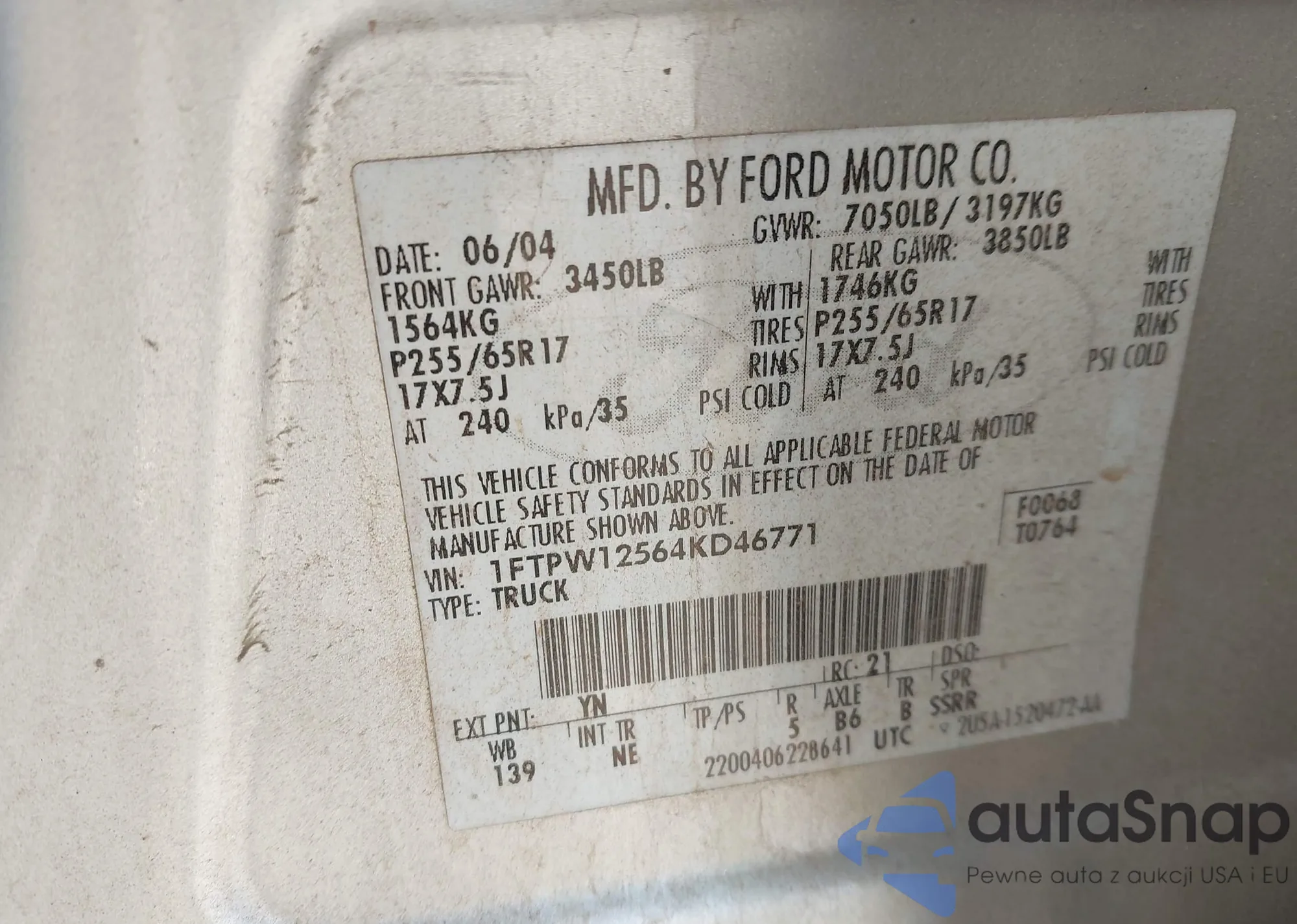 LOT: 44292559 VIN: 1FTPW12564KD46771